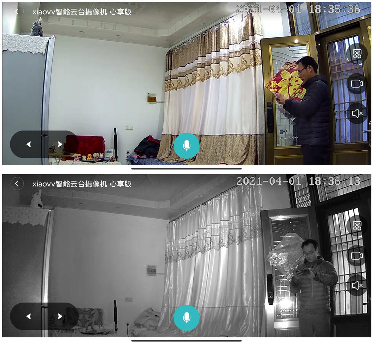 晚上天黑了,摄像机会自动启动内置的红外灯,进入红外夜视模式(黑白图像)。红外模式下的画面还算清晰,10米左右以内,能够基本分辨人脸。如果收到监控报警信息,可以第一时间查看,并且在手机APP端可以直接点开语音对讲功能。当然了,一般情况下,我的这个对讲功能都是督促孩子学习之类的。