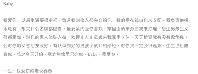 陈小春妻管严人设永不倒,甚至在婚礼上为应采儿写了一封保证书。