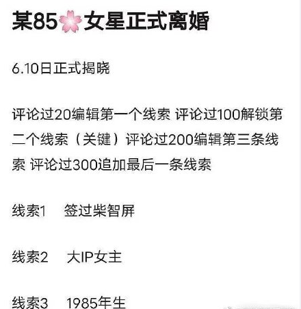 事情是这样的:近日,某知名娱乐大v突然爆出一则巨瓜,称某85后女星正式离婚,还说道等6.10号揭晓谜底,并提供了以下几条线索:
