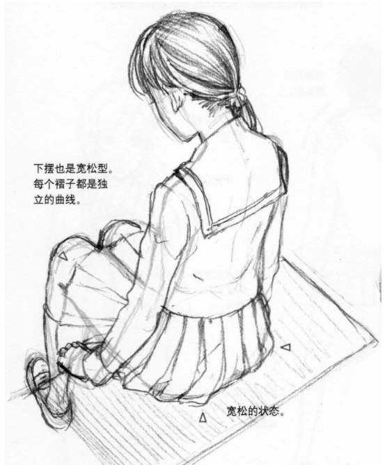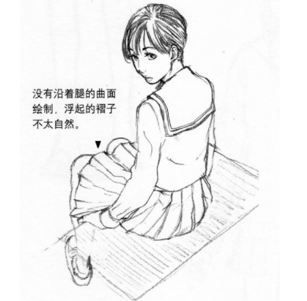 这里裙子下摆也很贴身,但是裙子的褶皱完全展开,形成一条完整的曲线。注意坐下的样子,裙子紧紧裹住臀部,处于贴身状态。