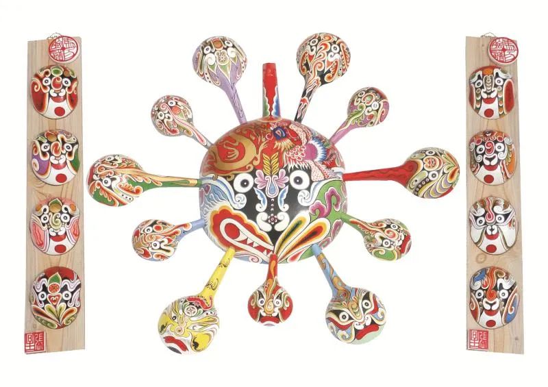 马勺脸谱,它是陕西传统特色手工艺品,属于宝鸡社火脸谱的一种,在陕西民间,春节至今仍有耍社火的习俗。马勺原本是当地中国先民的一种生活用具,从夏商沿用至今,选用优质的桐木、春木、桃木等作为原料,通过手工一刀一刀精雕细刻而成。社火马勺脸谱传承着中华上下五千年的渊远文明,记载着周秦文化最辉煌的民俗过程。