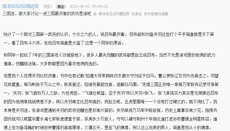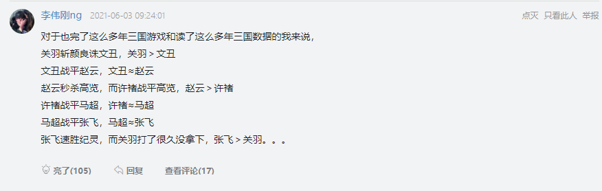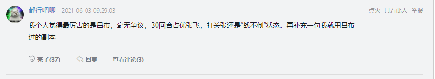 该JR的言论,引起了不少网友的非议,有人表示尽管没正经地看过正史,但从三国演义的描述来看,吕布无疑是天下第一的。他在30回合内占优张飞,打关张还是“战不倒”状态,而且吕布在《攻城掠地》内,游戏前期,战神无双;貂蝉相伴,杀穿三国。这简直就是身处巅峰的人生赢家啊!吕布当为三国第一武将。