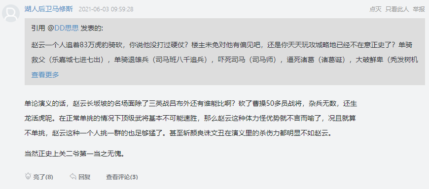 更有大部分网友认为,赵云才是三国武将第一人,毕竟他单枪匹马就能追着83万虎豹砍,还能在乐嘉城七进七出单骑救父,还能在长坂坡银枪如龙十步十杀,吓死司马师,逼死诸葛诞……
