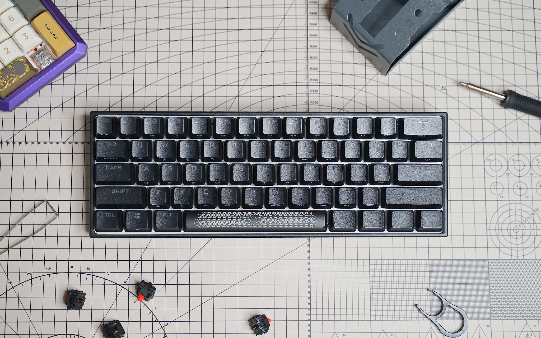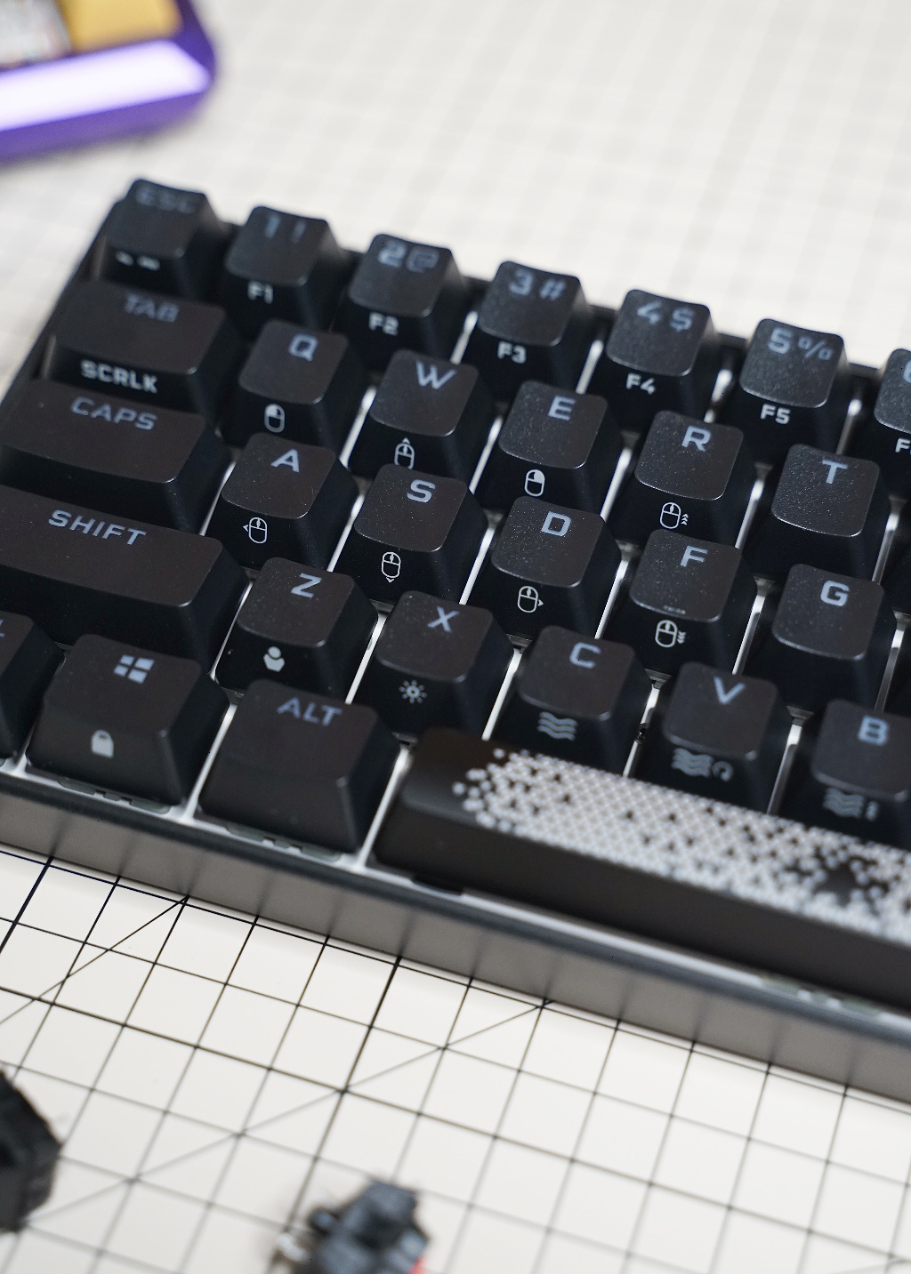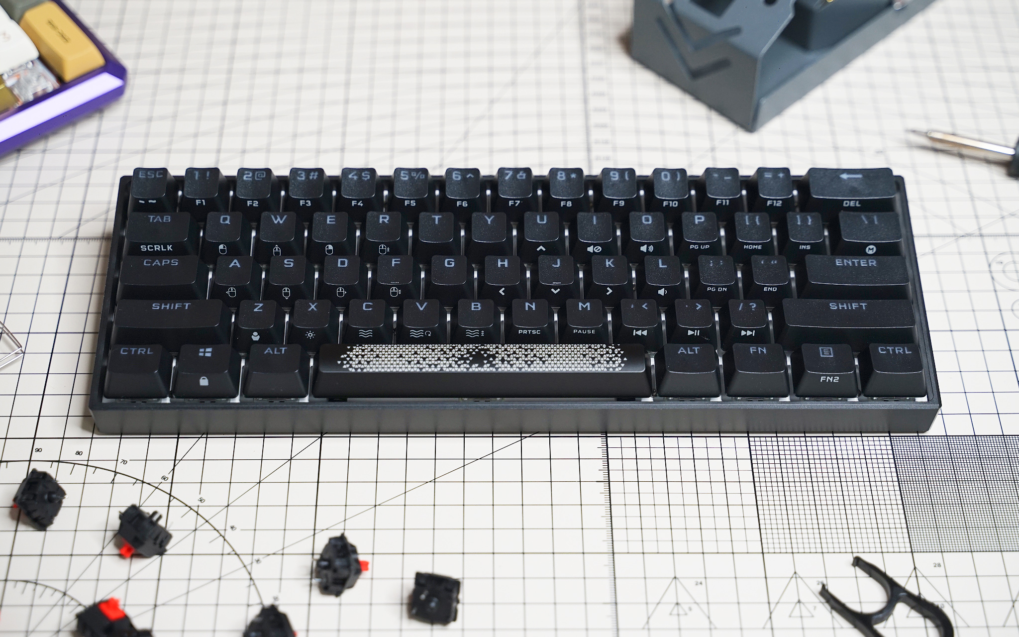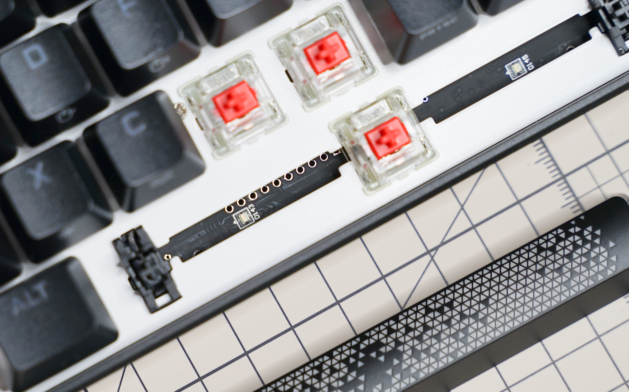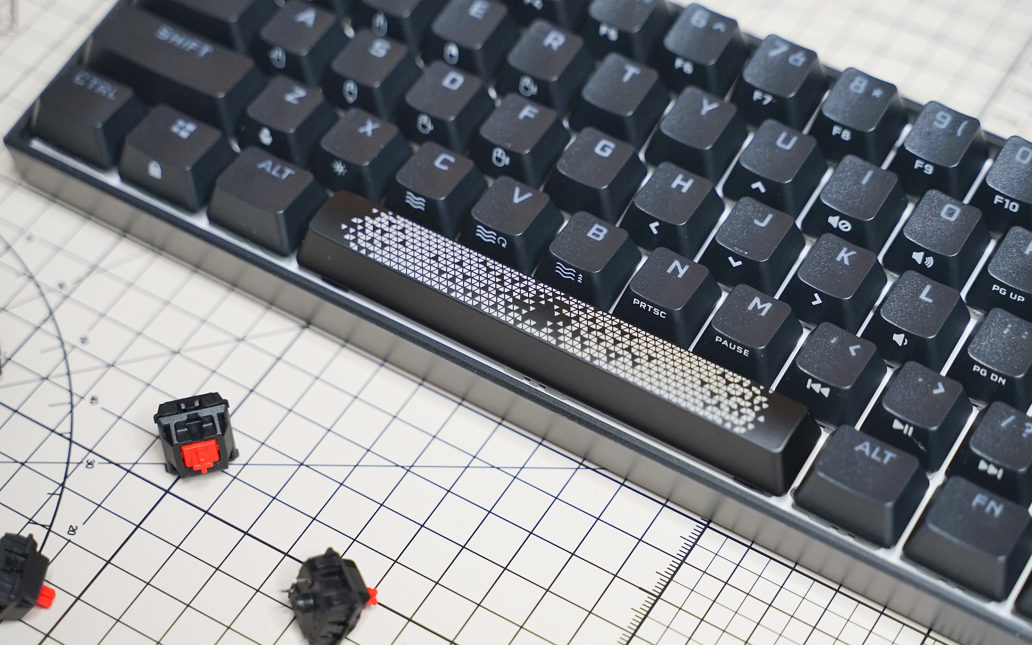 K65 RGB MINI 所以键帽里最特殊的就是这个空格键,它的透光区域几乎覆盖了整个键帽,表面图案是熟悉的三角纹路。主板上有两个 RGB LED 灯珠,加上轴体下方的一个,空格键就有三个灯珠了。