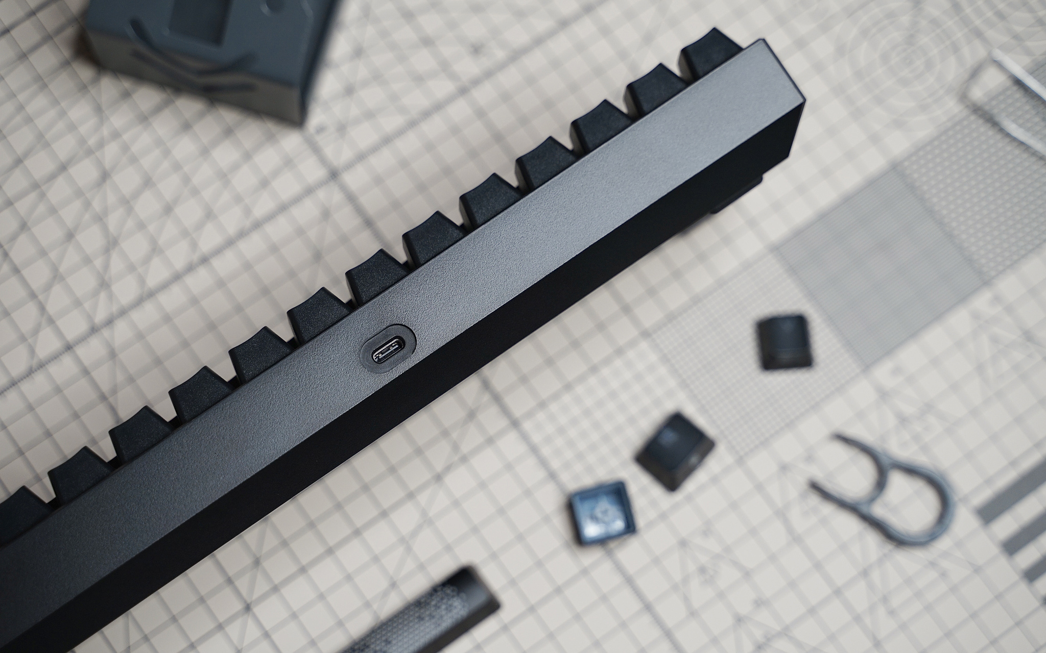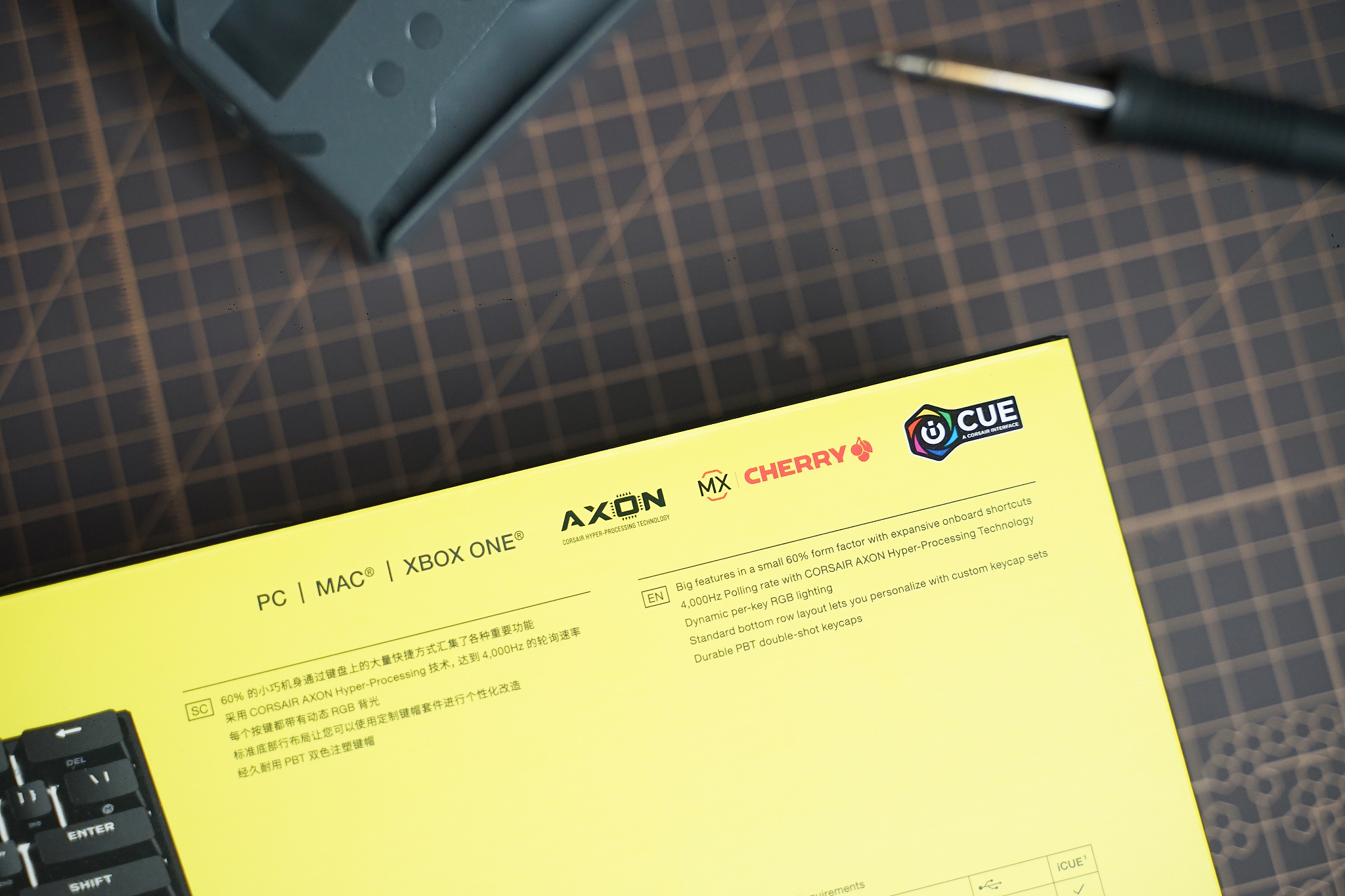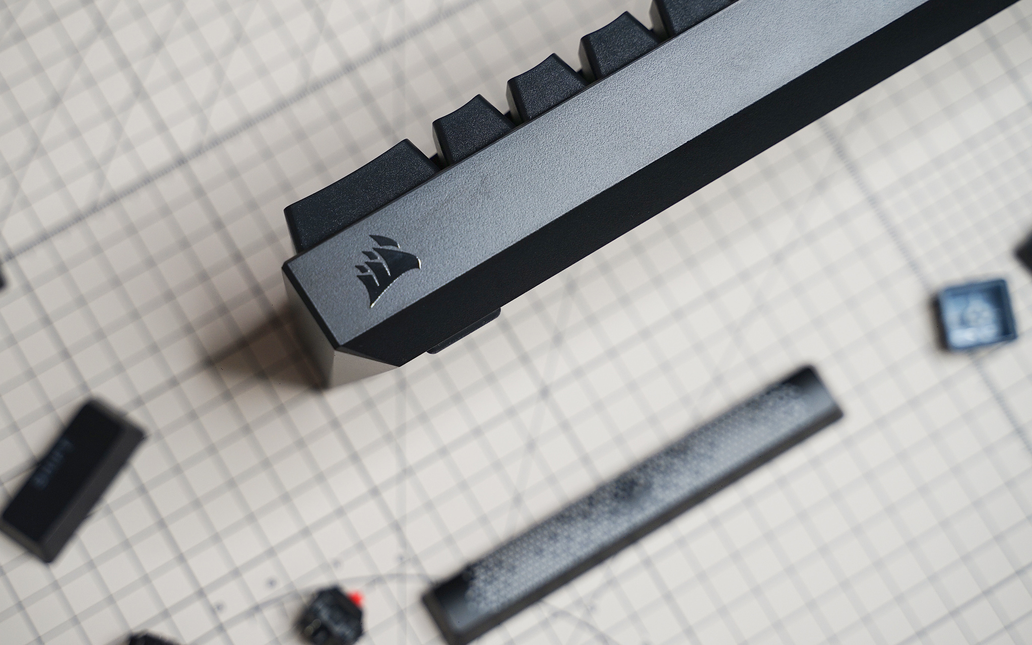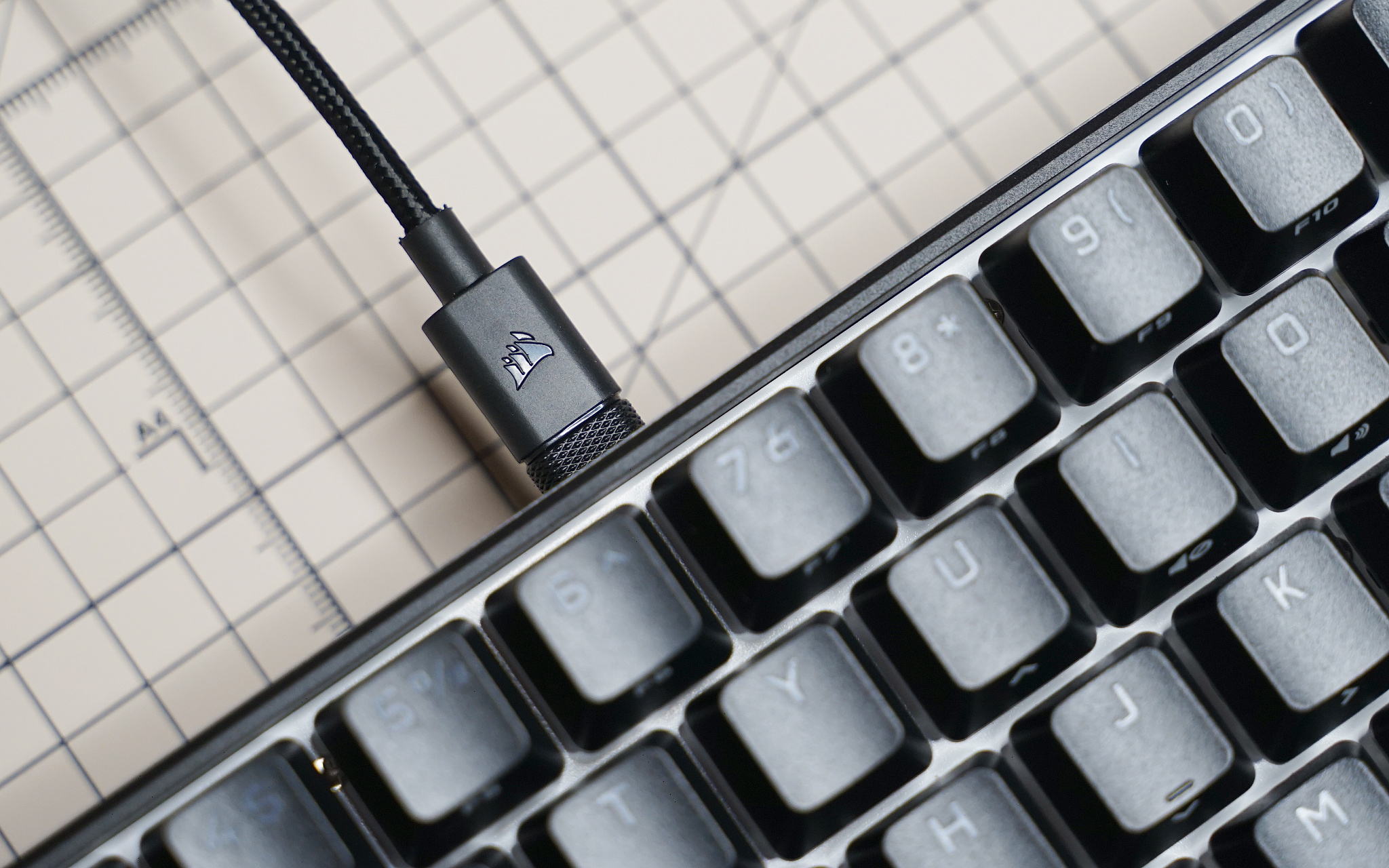 也许是为了方便便携收纳,K65 RGB MINI 采用分离数据线的设计,线材直径相比之前入手的 K100 要小,也更加柔软,这样也方便收纳进行李箱。除此之外,还附赠了一个塑料拔帽器、普通空格键、一个海盗船图标 ESC 键帽,最后还有说明书。