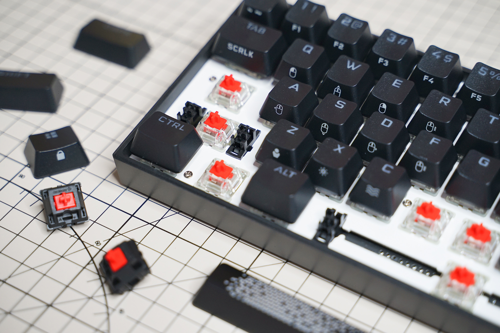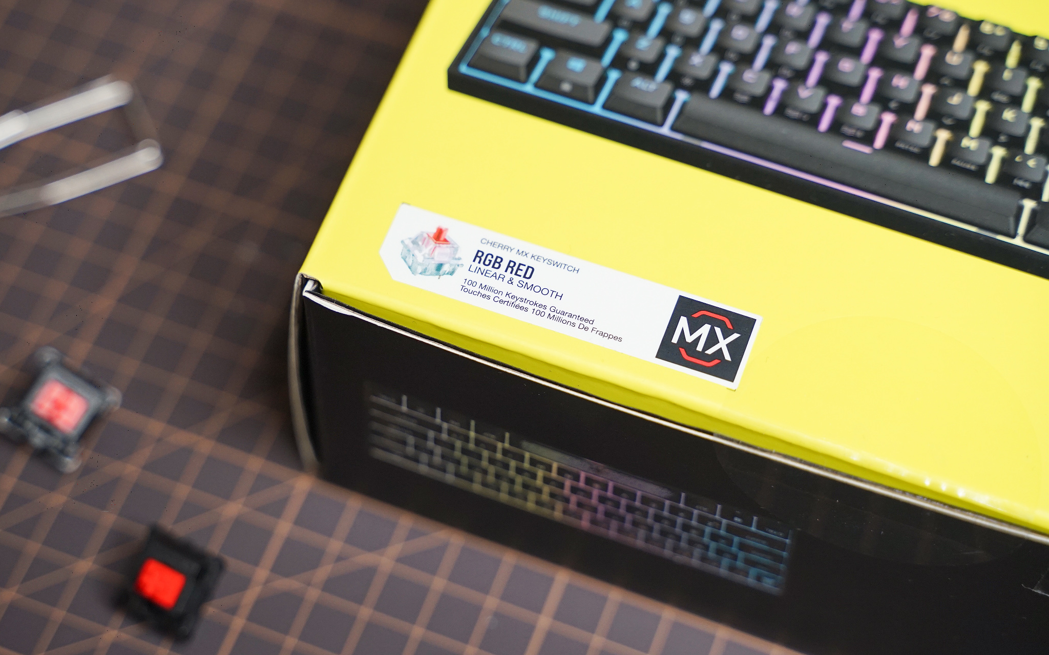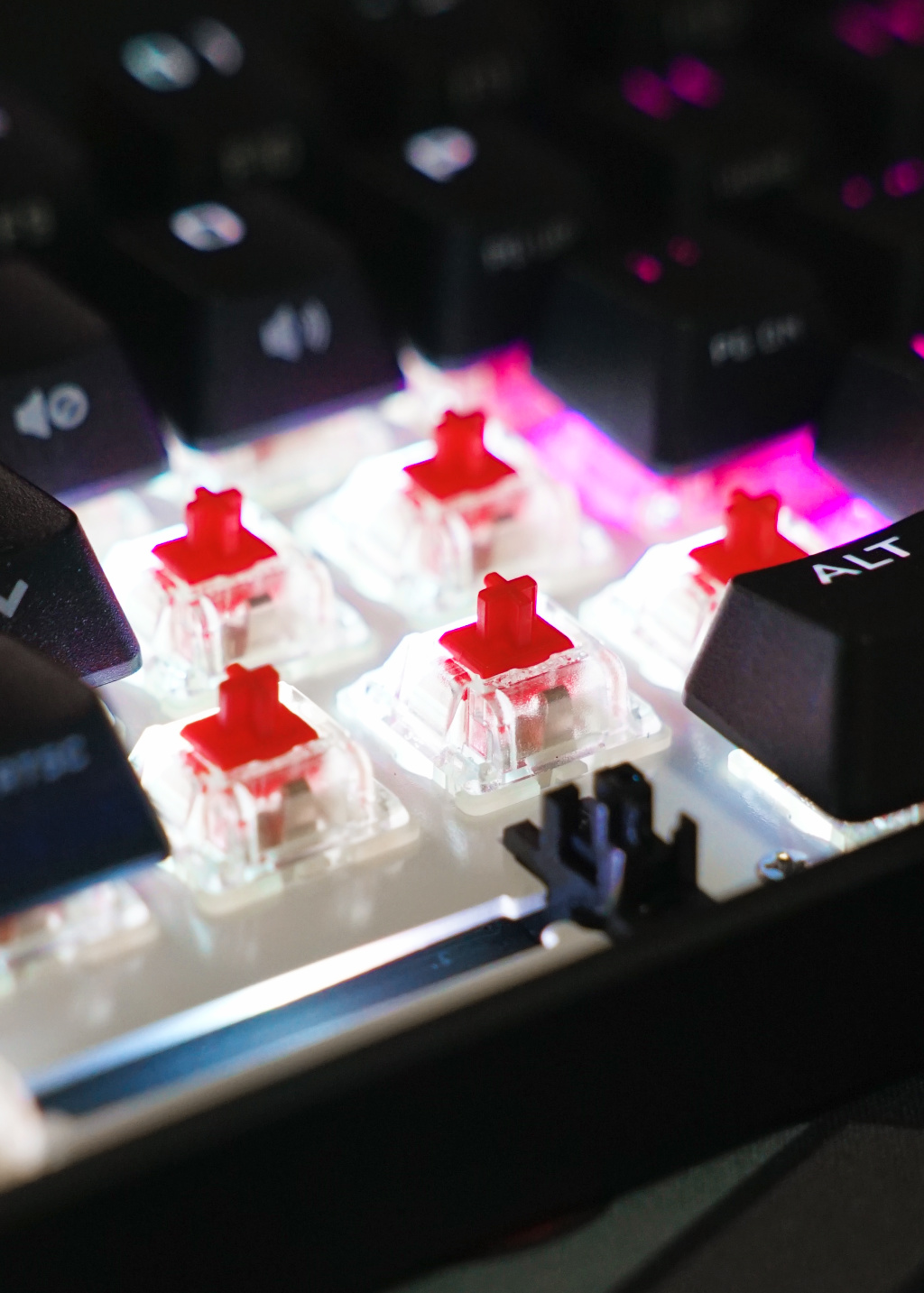 目前 K65 RGB MINI 只有 Cherry RGB 红轴可以选择,跟普通红轴相比就是轴壳是透明的,大键位均采用卫星轴设计,按压平稳,只是触底有些不干脆。
