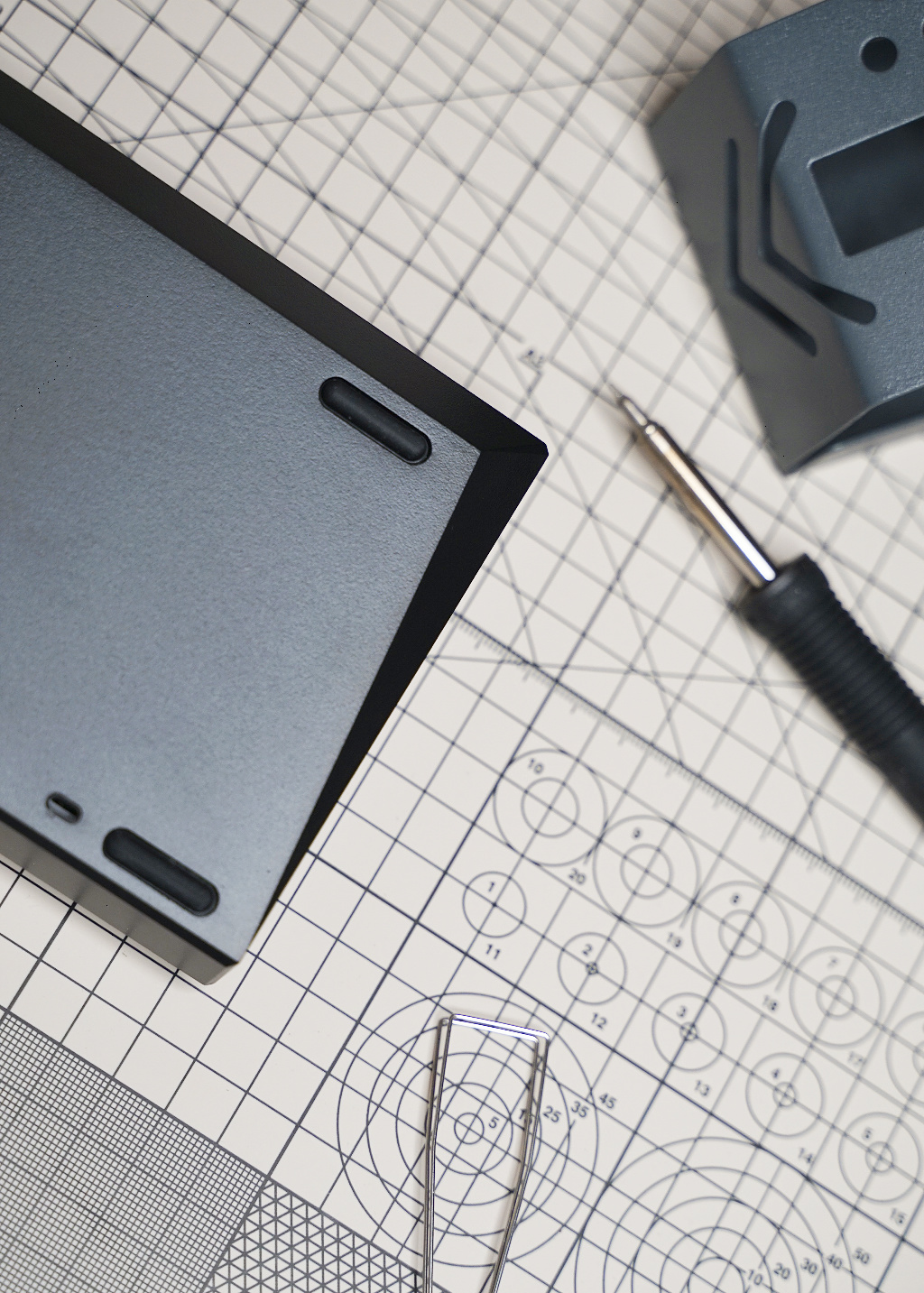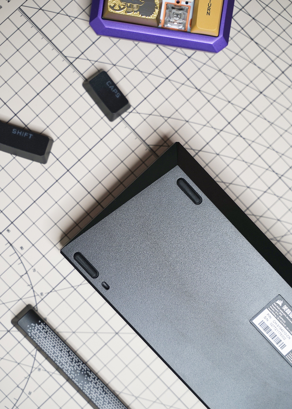K65 RGB MINI 底部设计很简约,四个角各有一个防滑垫,略有点缀的设计就是方法棱角结构,同时这也是键盘固定的支撑角度。