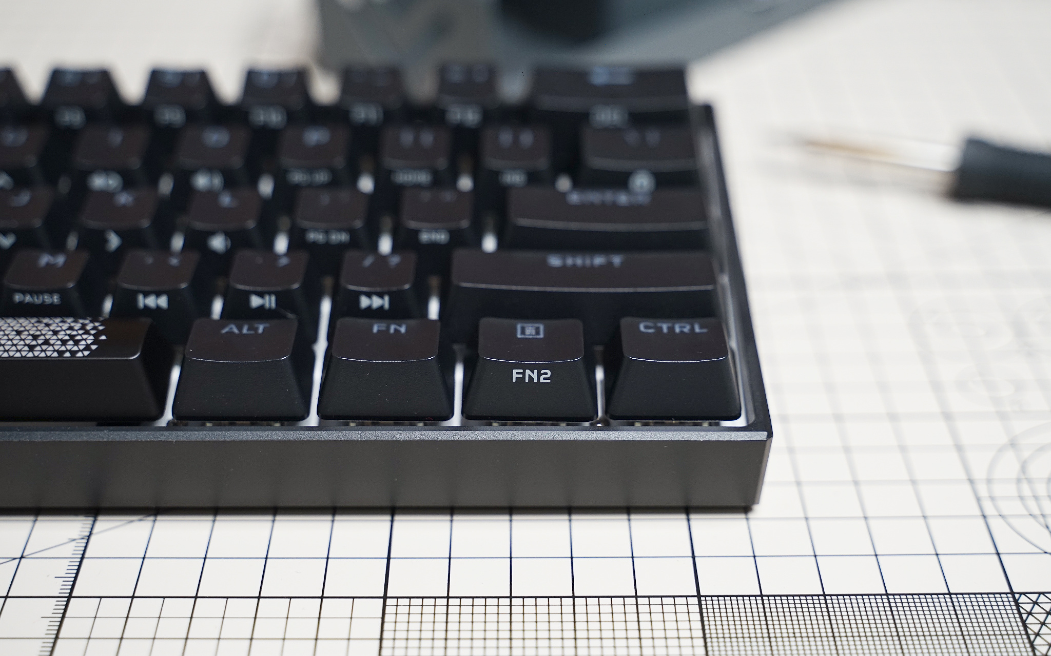 尽管采用 60% 配列,只留下了文字录入区域及周边一些功能键,但是结合 FN 键可以实现很多特殊功能,比如使用方向键,再比如控制音量等。在对应键帽侧面都有对应功能的图案标准,看起来一目了然,用起来也会方便一点。