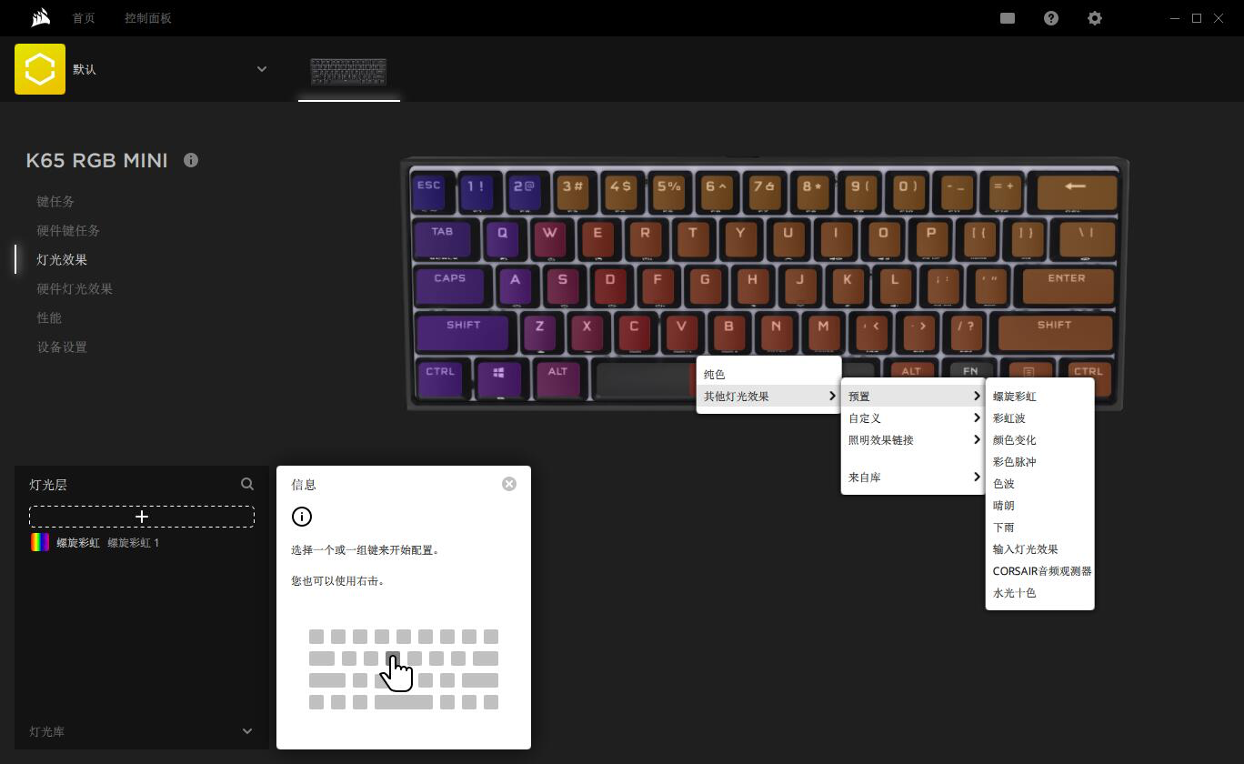 键盘小归小,RGB 灯效上还是不含糊,螺旋采用、彩色脉冲等效果也都包含在预设内,另外通过驱动也可以自定义灯效设置。