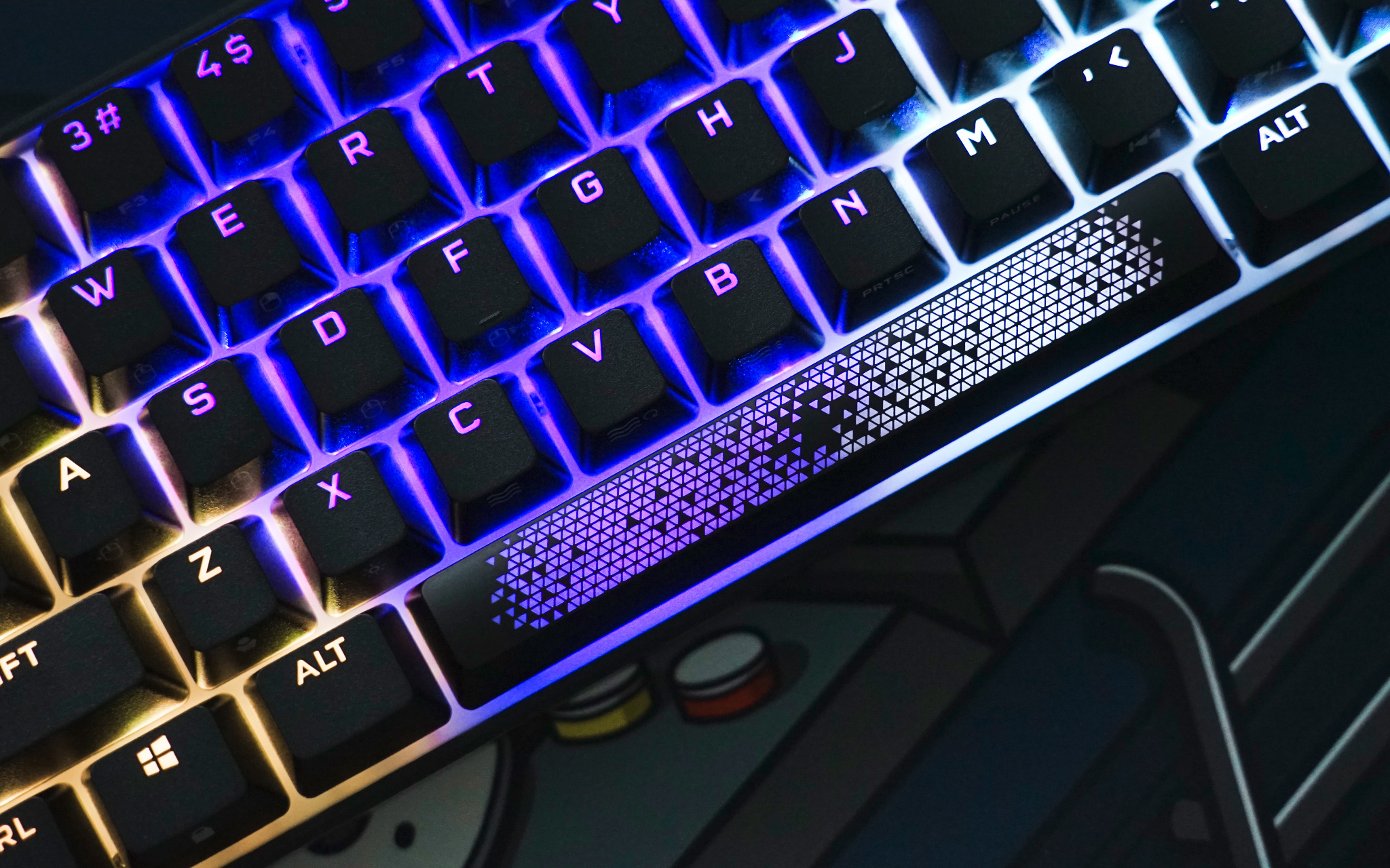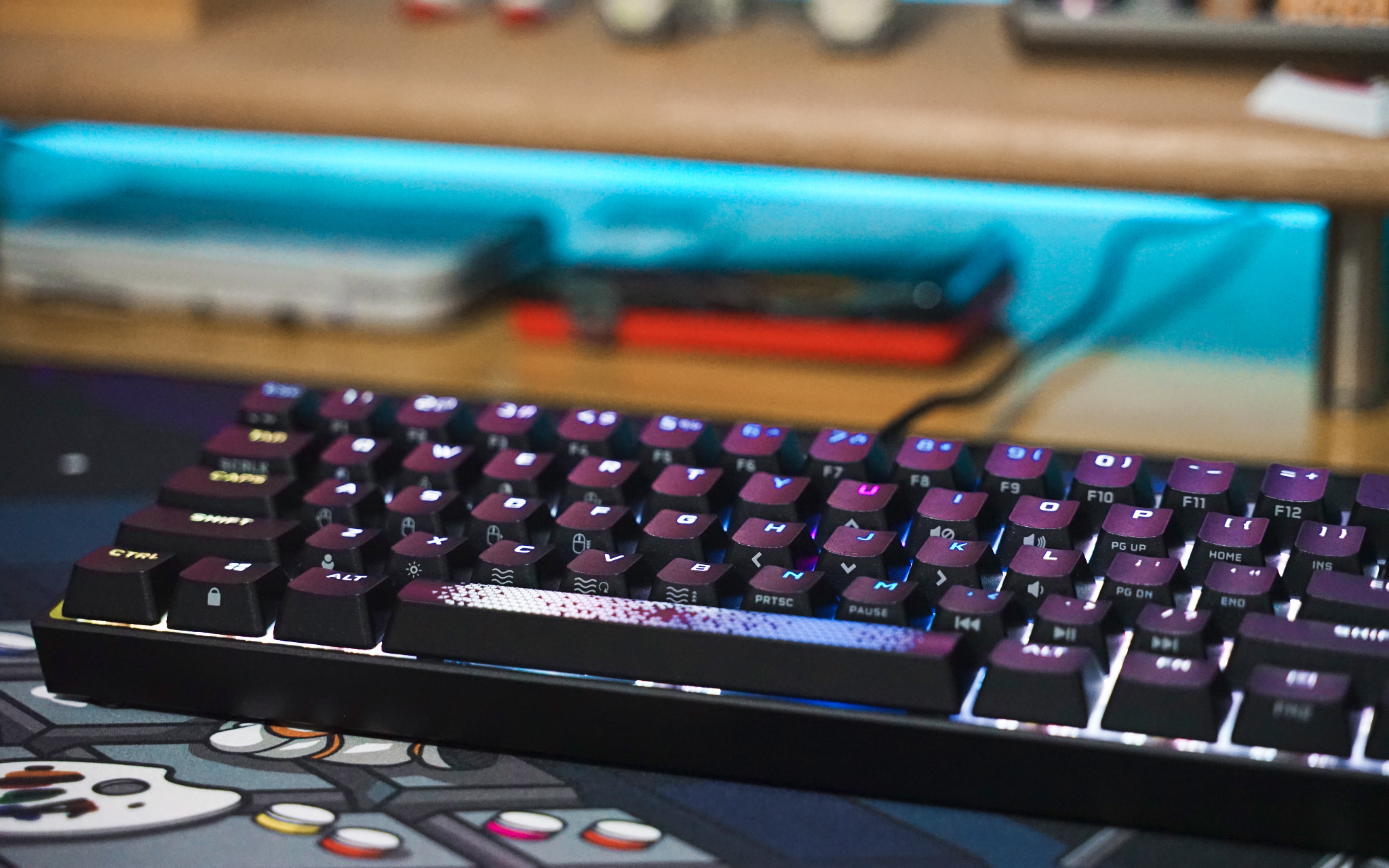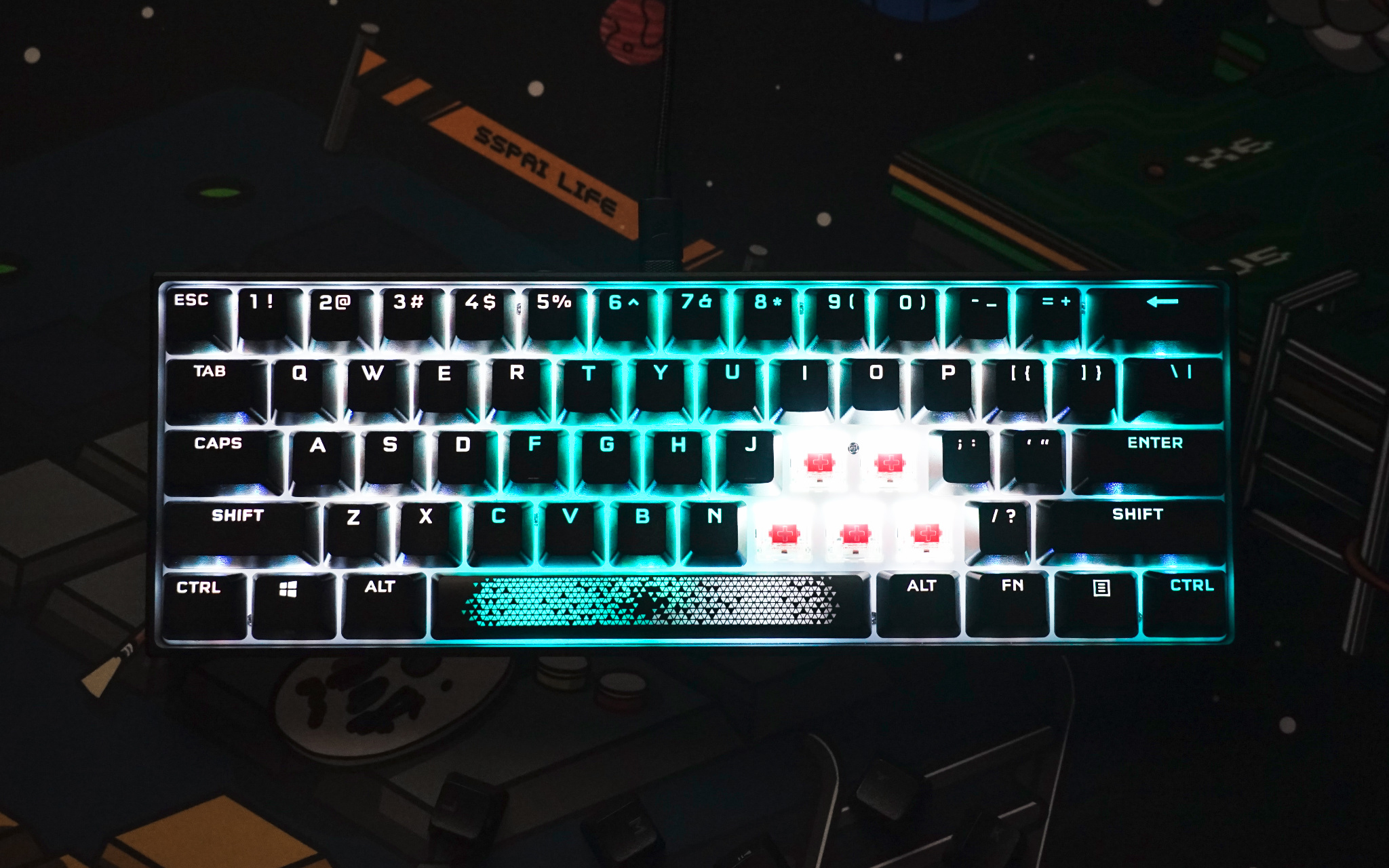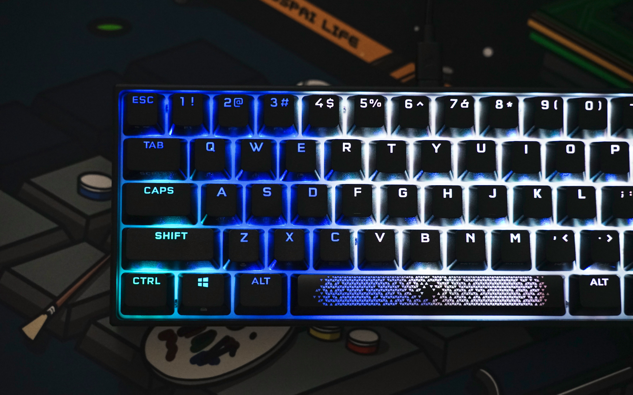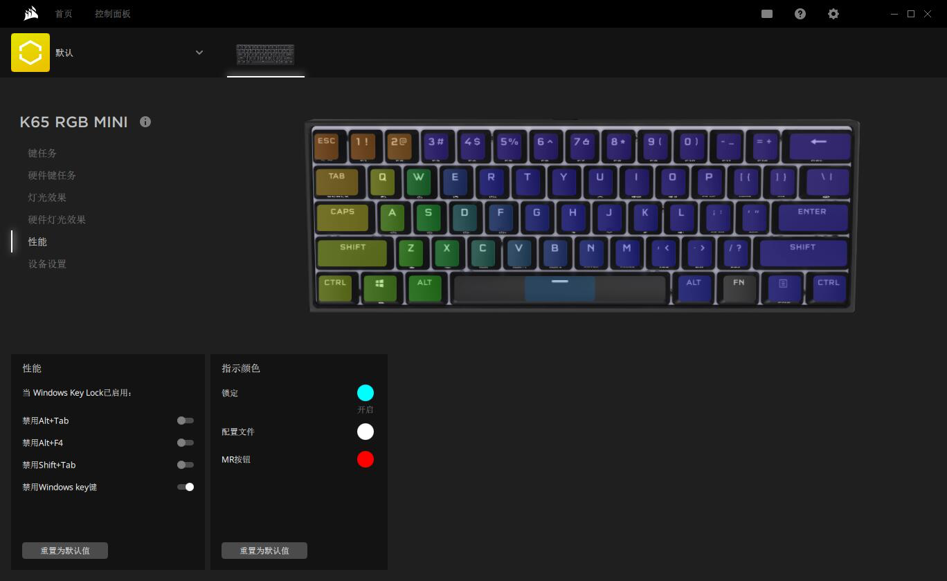 最后来看看 K65 RGB MINI 灯光效果,由于空格键有三颗 LED RGB 灯珠加持,所以灯光色彩过渡就比较自然。