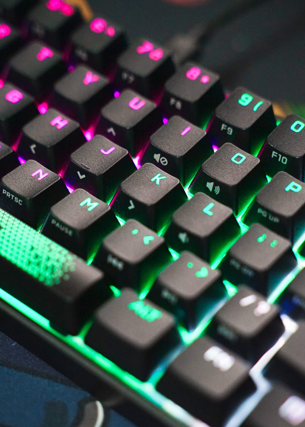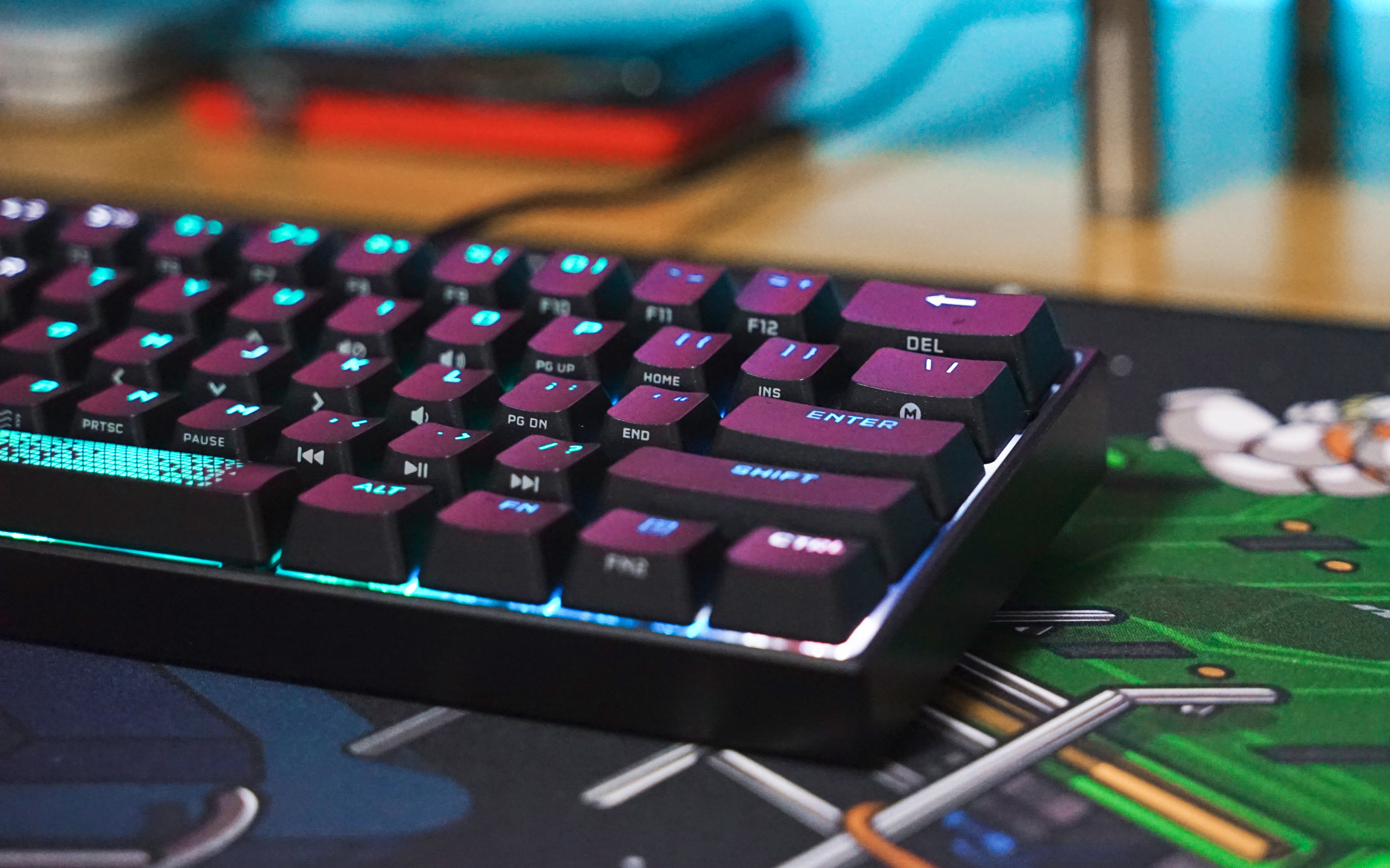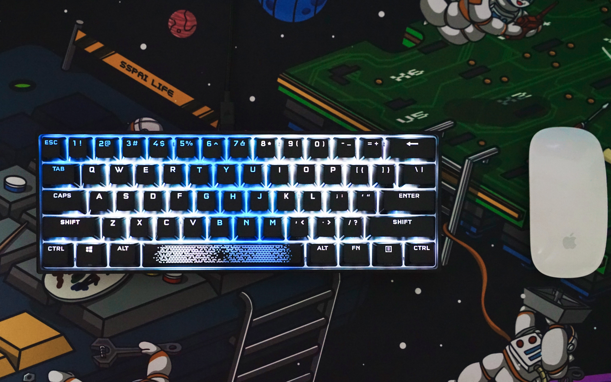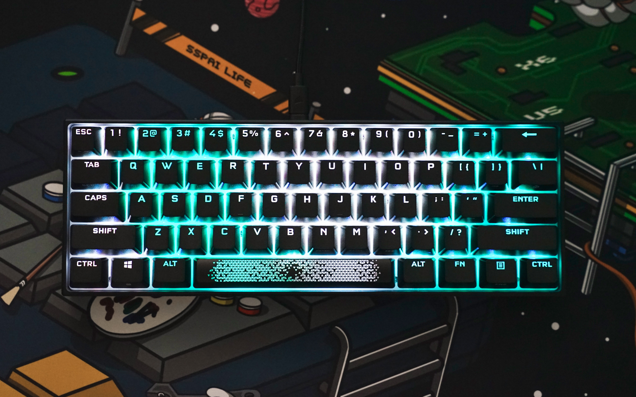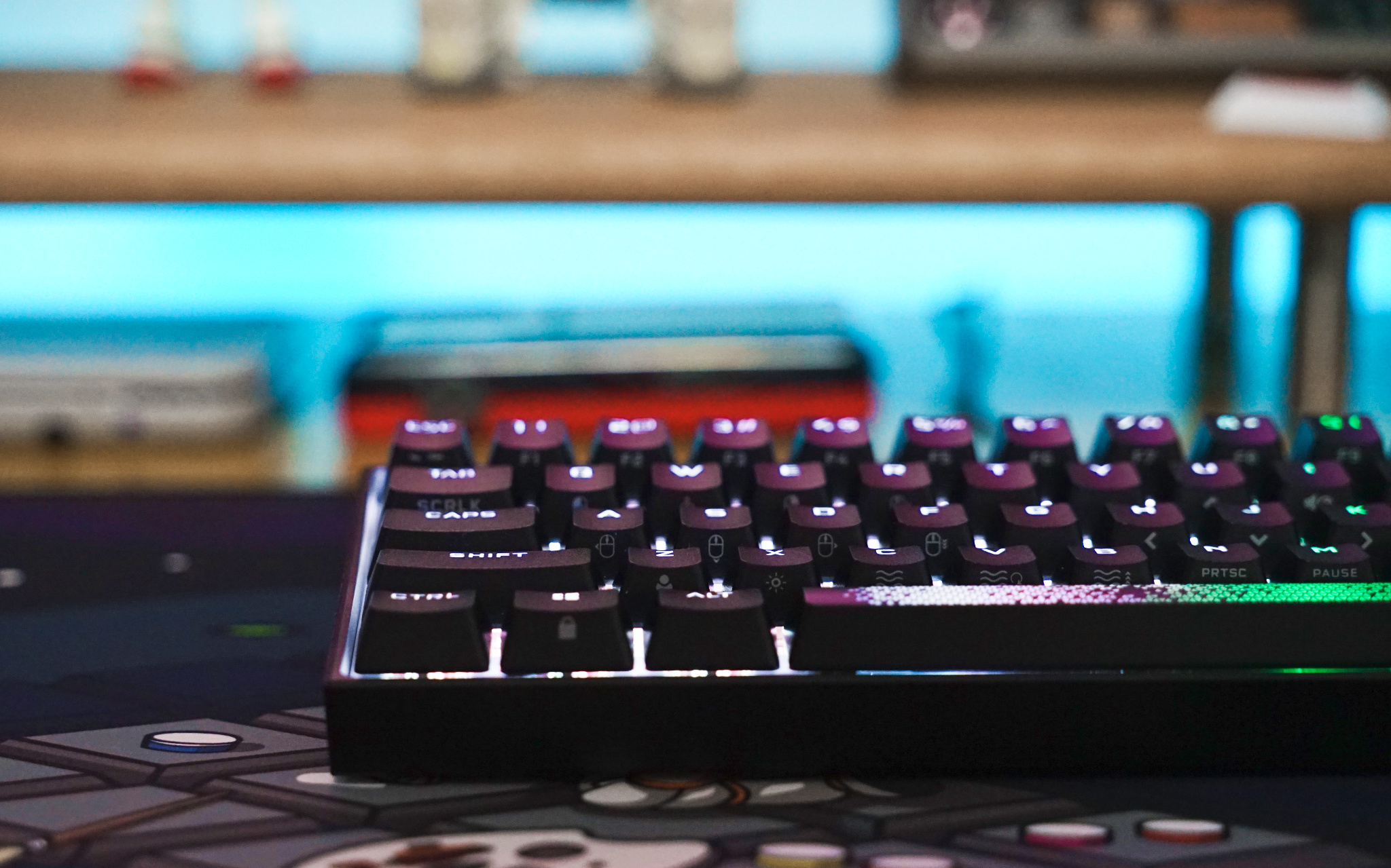 最后来看看 K65 RGB MINI 灯光效果,由于空格键有三颗 LED RGB 灯珠加持,所以灯光色彩过渡就比较自然。
