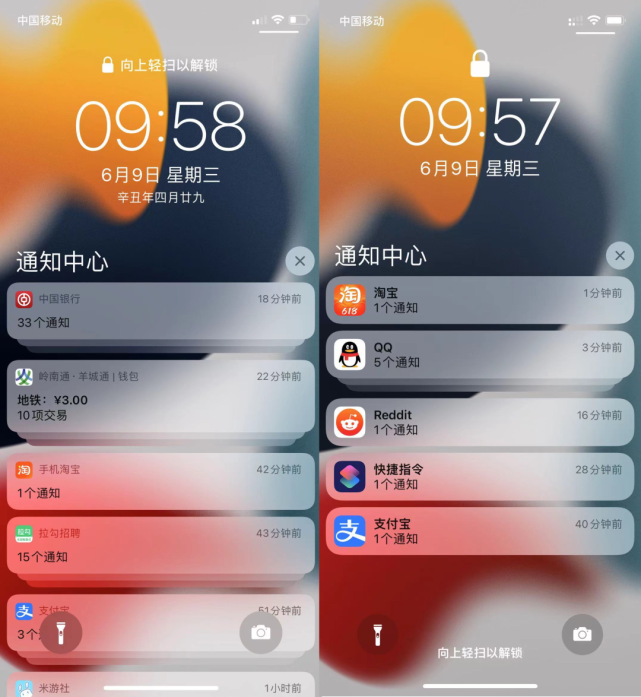 同样重做的还有锁屏的通知中心,把原本的通知缩得更加紧凑了。