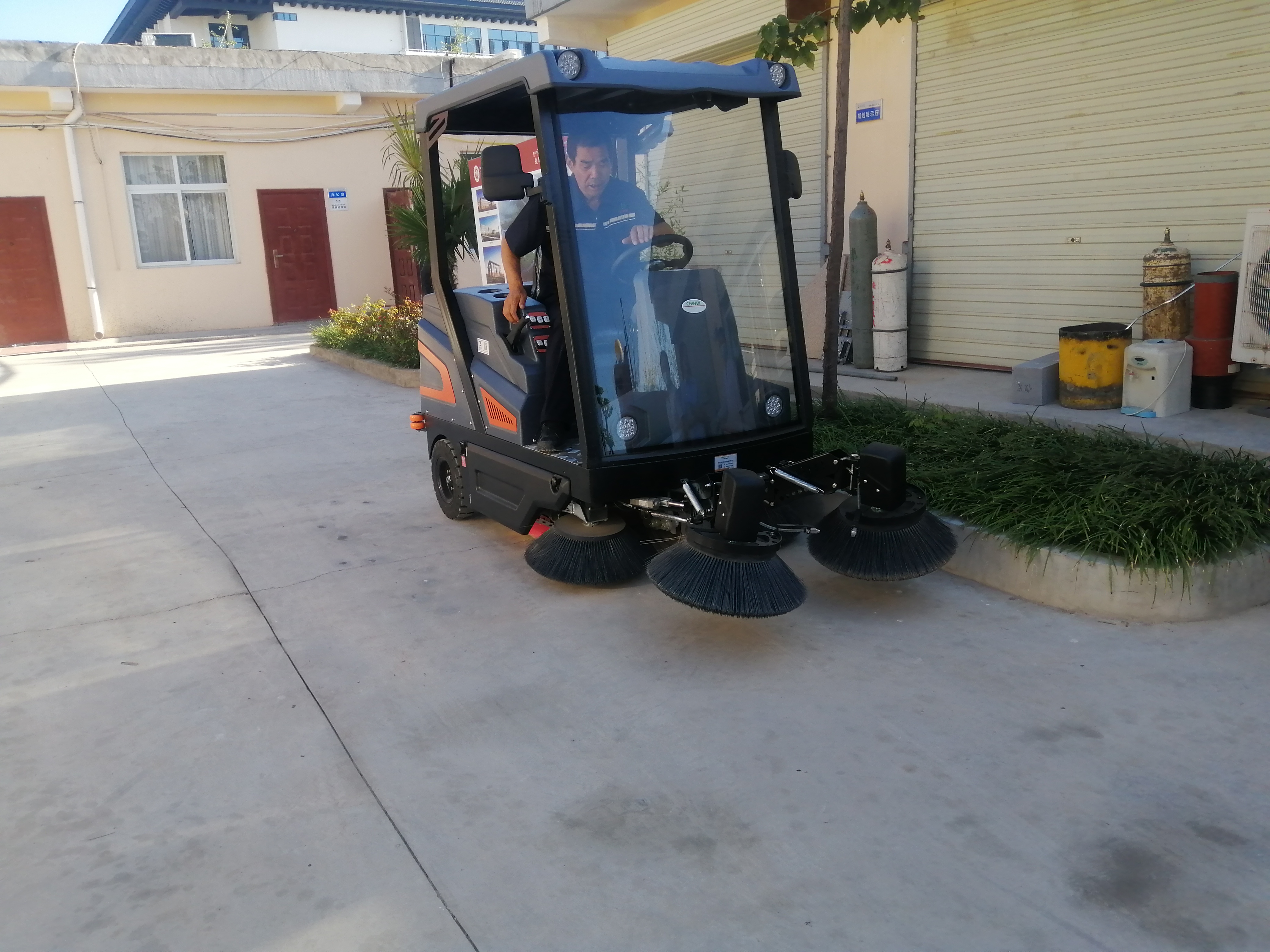 大型驾驶式扫地车,每小时可打扫 2万平左右的地面,配有多个边刷,当扫地车运作时,所有的边刷便会同时启动,对地面上各个角落进行打扫。大型扫地车可替代10-15名保洁工人。主要用于大型工厂园区等宽泛的场所。