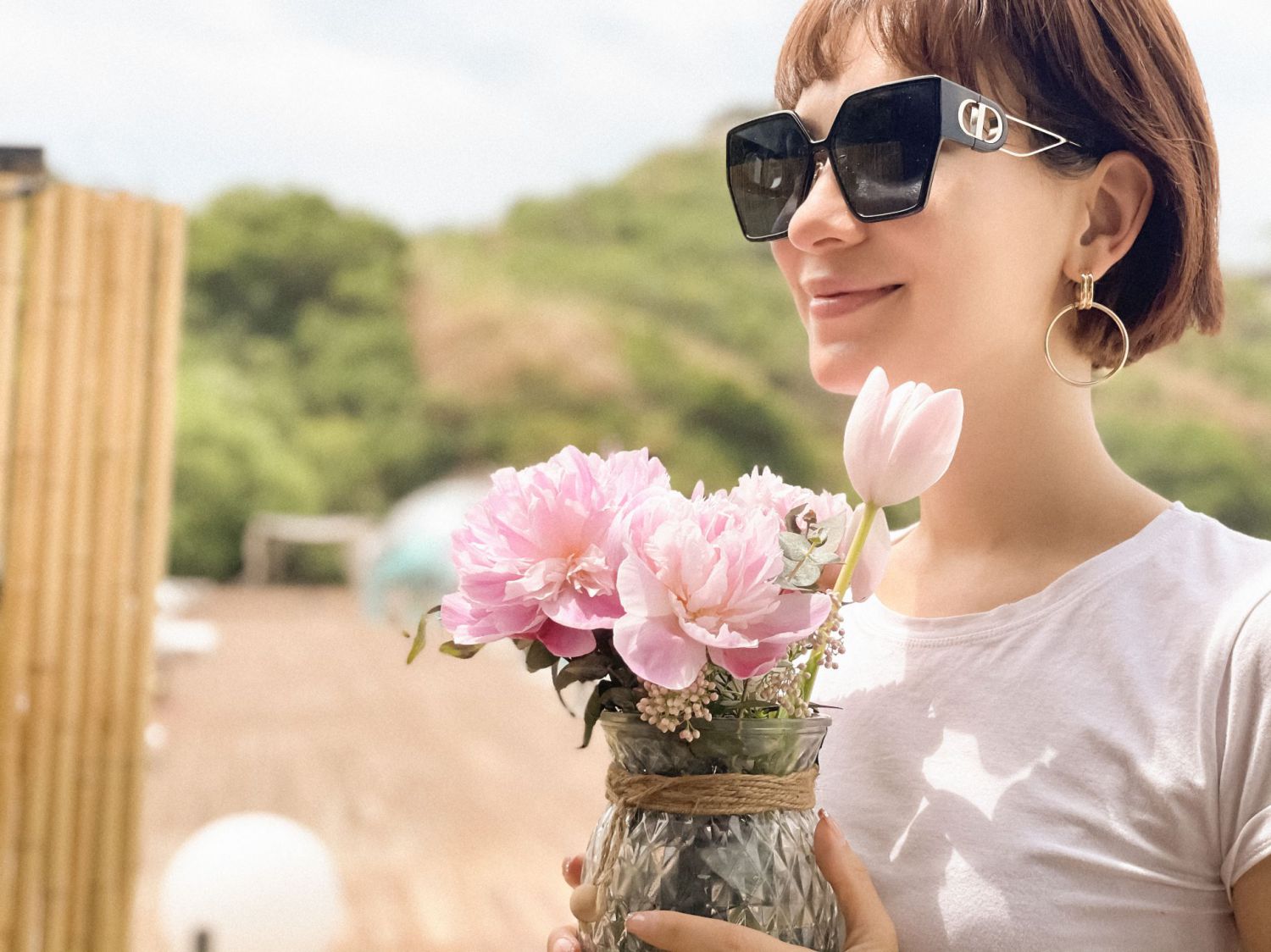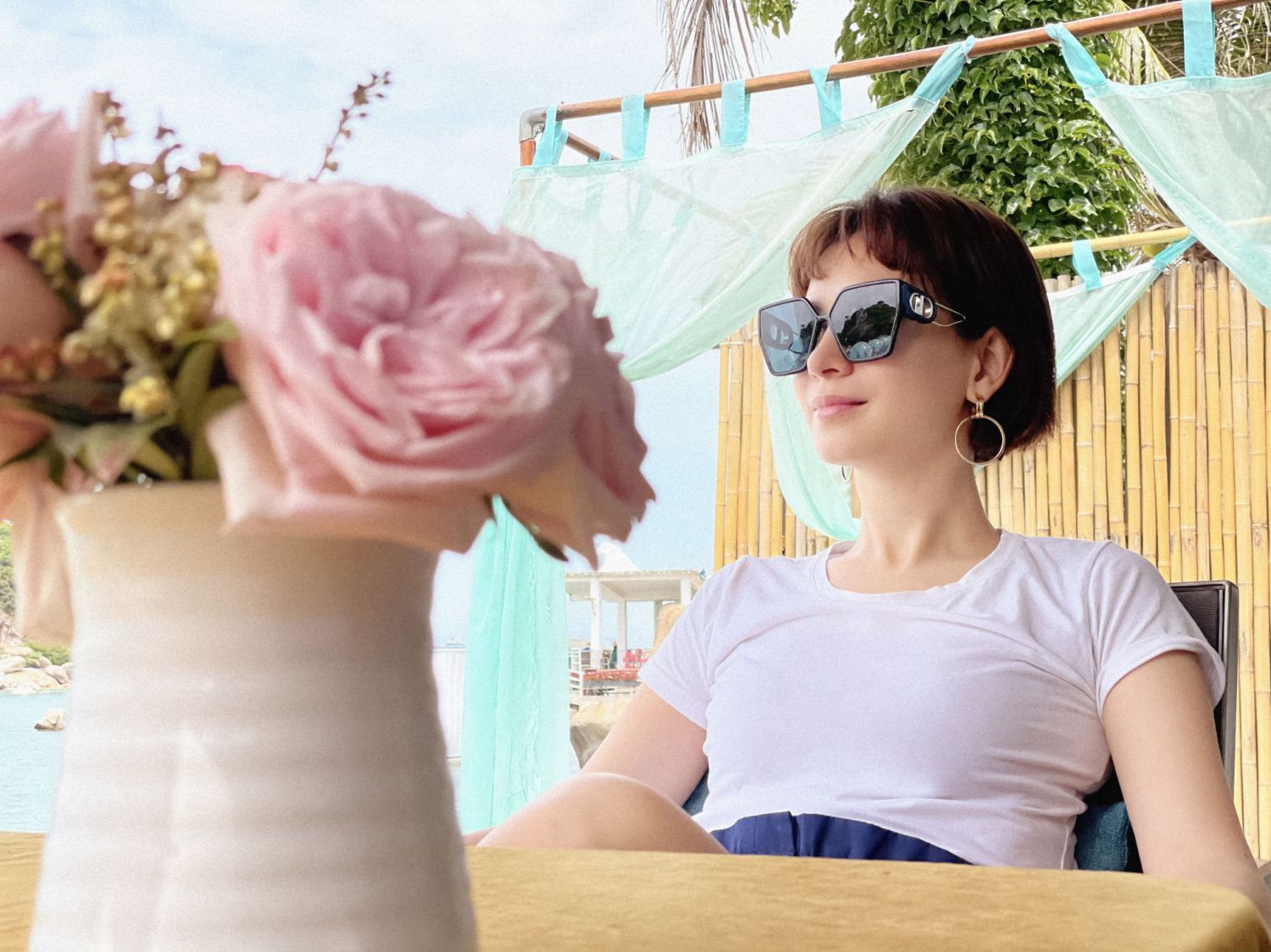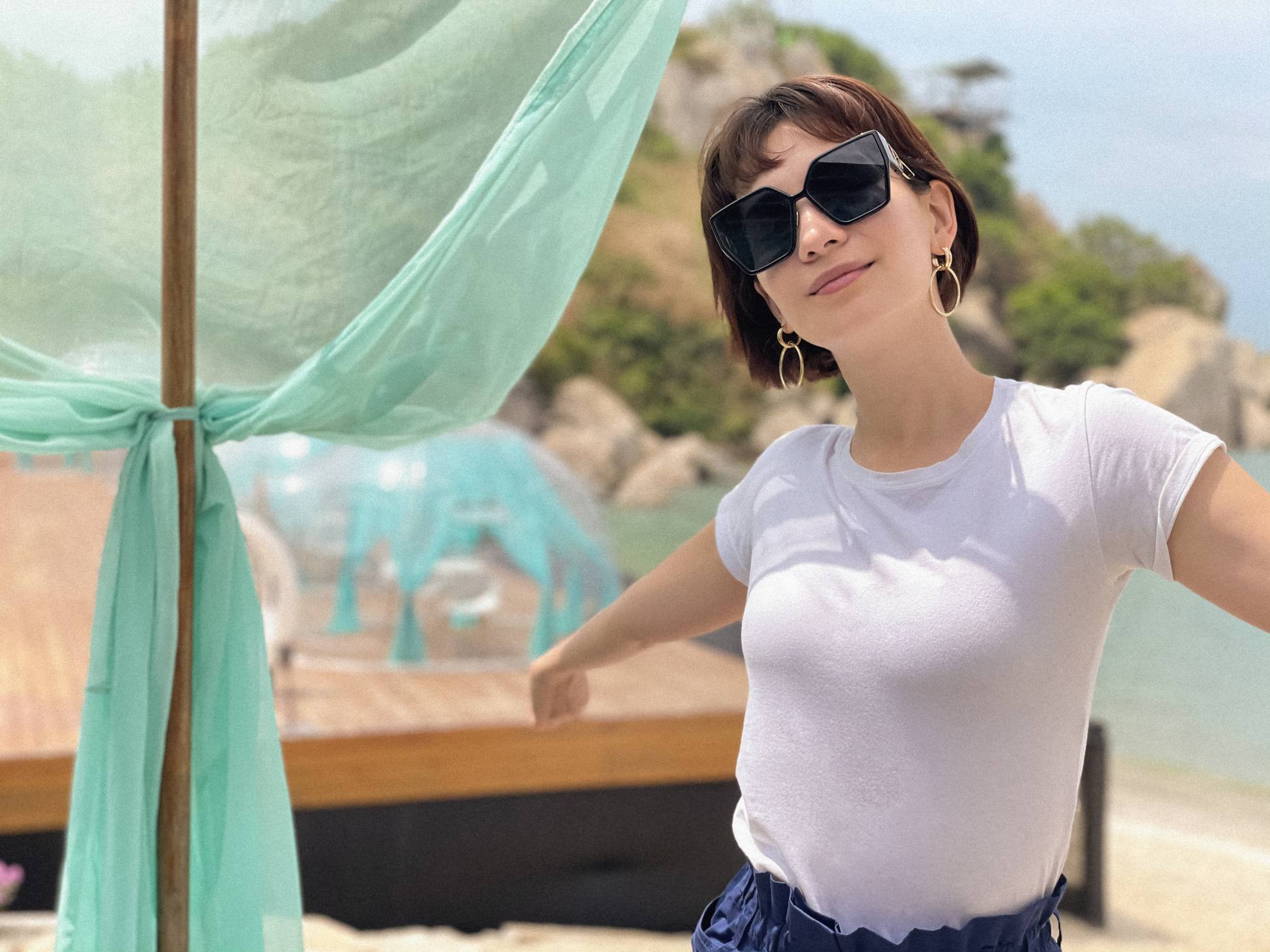 照片中,卢靖姗身着纯色白T,搭配藏青色阔腿短裤,简约造型活力十足,与夏日度假的主题十分契合;方框墨镜搭配简约设计圆形耳环,为整体造型增添时尚感。卢靖姗微笑温柔甜美,面对镜头展示悠闲自如状态,以轻松肆意的姿态,与夏日的海风相拥。