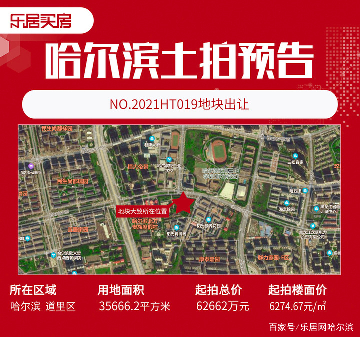 NO.2021HT019地块位于道里区哈双北线1.5公里处,用地面积35666.2平方米,其中,地上建筑面积不大于99865平方米;地下面积以工程证最终审定的规模为准。该地块出让起始价62662万元,规定容积率不大于2.8,用地性质为二类居住用地兼容商业设施用地。