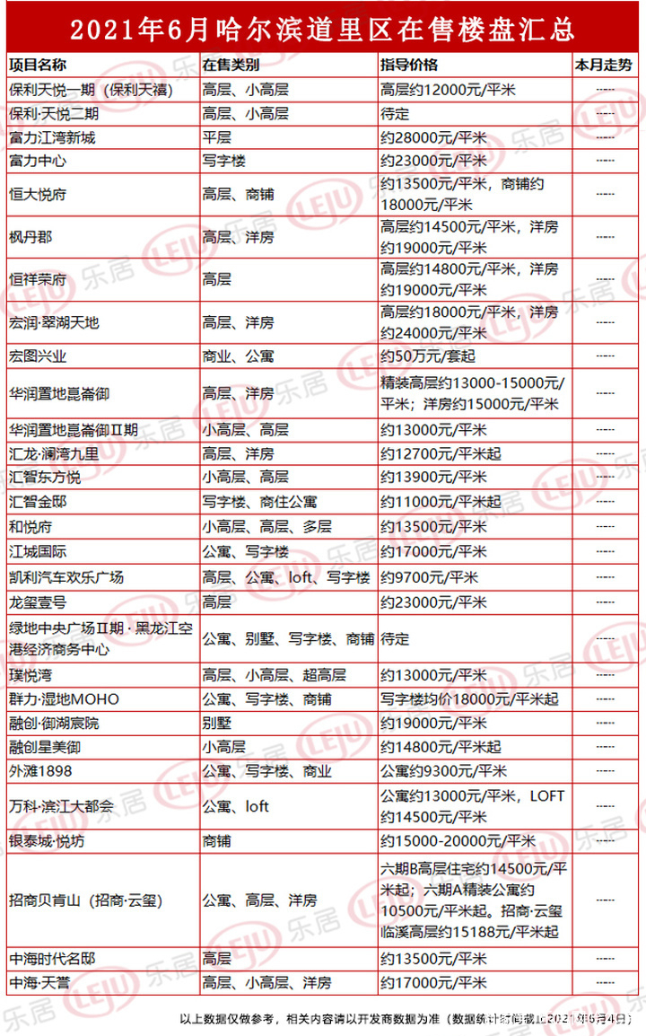 乐居哈尔滨整理6月份哈尔滨道里区在售新盘价格表如下: