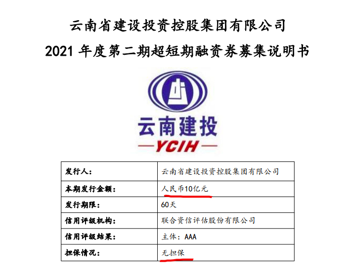 中华网财经6月9日讯:据上清所披露信息,云南建投发布2021年度第二期超短期融资券募集说明书,本期发行金额人民币10亿元,发行期限60天,信用评级机构为联合资信评估股份有限公司,信用评级结果为AAA,主承销商及簿记管理人为平安银行股份有限公司,发行日为6月10日,起息日为6月11日。