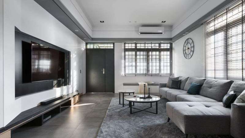 客厅区域,利用隐藏式手法,以斜面将收纳柜体与电视主墙结合,呈现干净利落的流畅画面,而灰阶家具、清新日光相互呼应,给予舒适迷人的第一印象。