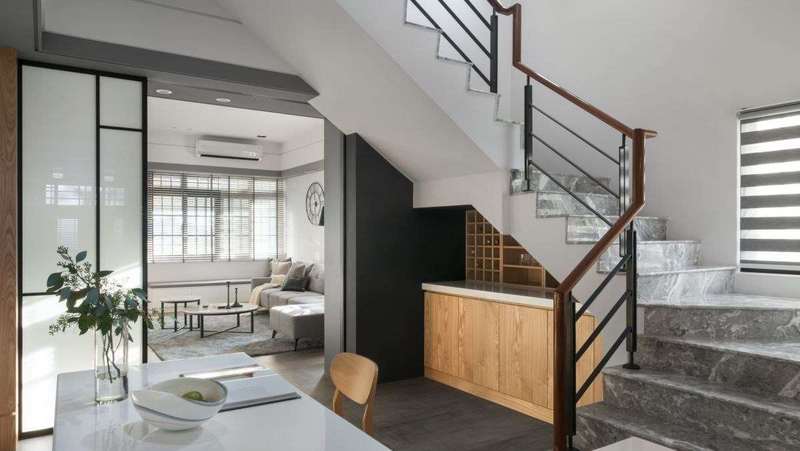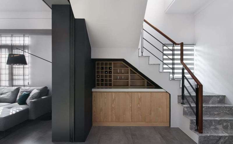 餐厅区域,缤纷挂画增添一丝温馨氛围,而中岛吧台与餐桌串起,满足女主人的备餐需求,一旁梯间的畸零处,则配置红酒酒柜,让男主人能一边小酌一边陪伴女主人料理晚餐。