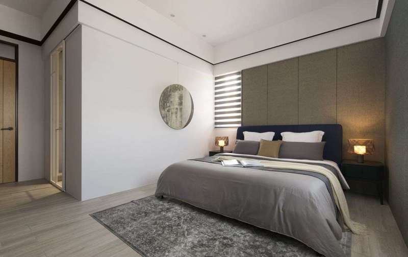 主卧区域,床头墙面铺陈浅灰裱布,并延续双色天花设计使其与深蓝巧遇,而更衣区和睡眠区则各自独立,打造放松舒压的休憩环境。