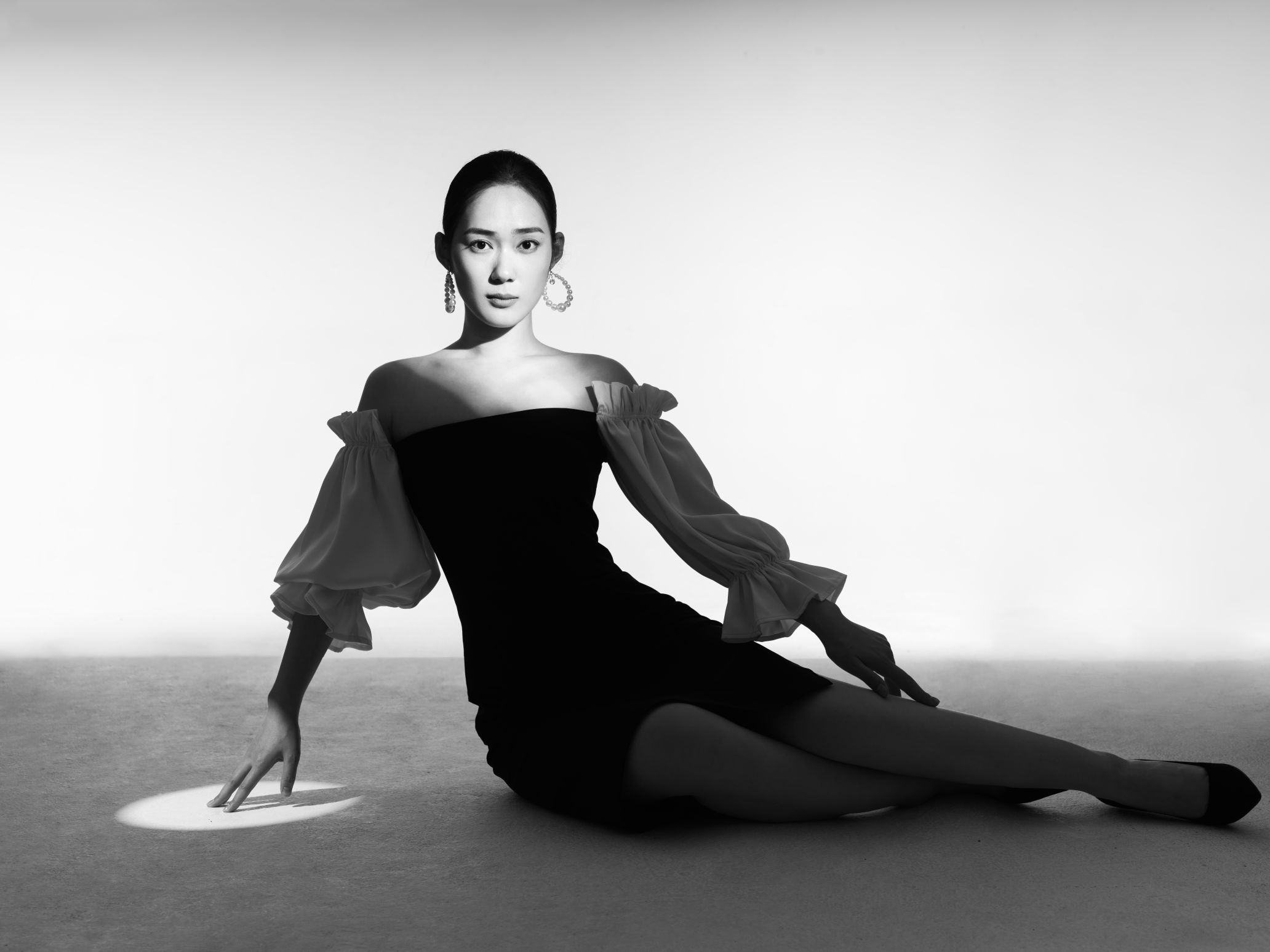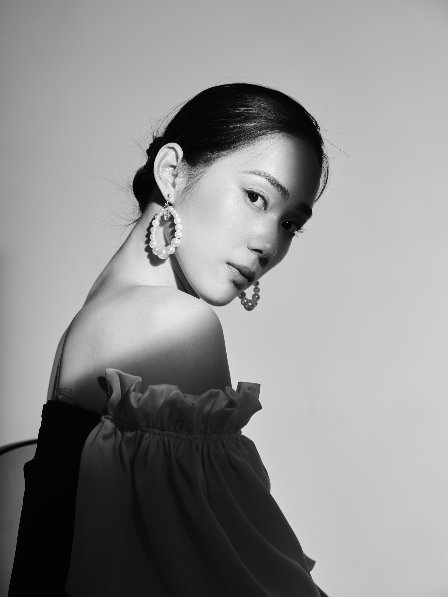 黑白灰光影细腻而有层次,韩聪聪眼神坚定,优美的脸型轮廓佩戴珍珠浮夸耳饰,镜头锁住的自然双眸,举止投足尽显女性万种风情。