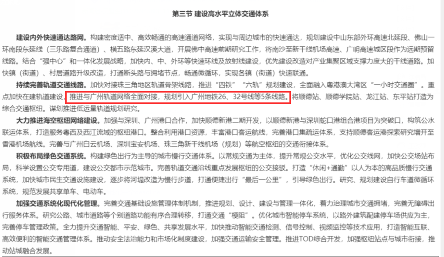 顺德则另辟蹊径,十四五规划提出重点加快在建轨道建设的同时,推进与广州轨道网络全面对接,规划引入广州地铁26、32号线等5条线路,将顺德站、顺德学院站、龙江站、东平站打造为综合交通枢纽,并谋划推进低运量轨道规划研究。