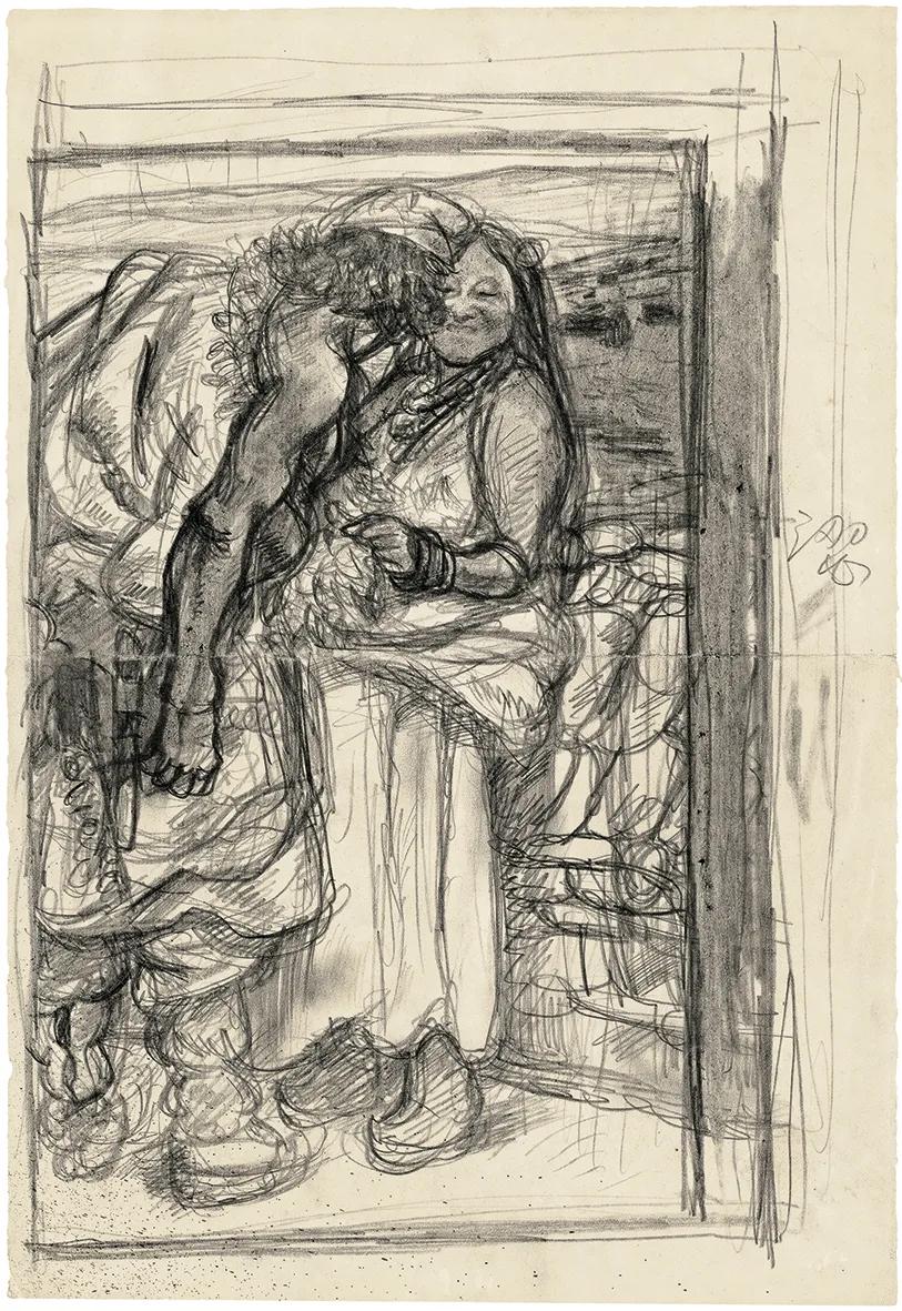 画出“三个母亲”中左侧的赤膊女人。