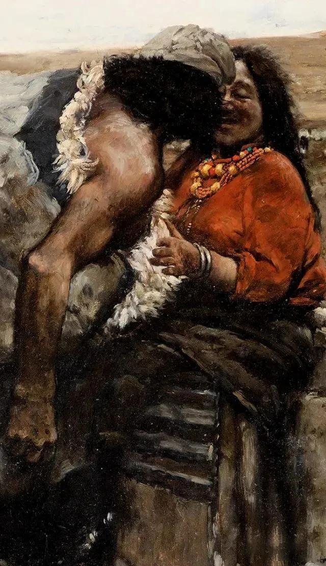 我画到这一幅才让我的人物笑了一下。我偶尔会想到别的一些描绘西藏的图画,也许那里画了太多的笑脸,我就不愿重复了。我让接吻的牧羊女笑,因为这种笑引出我的泪水。