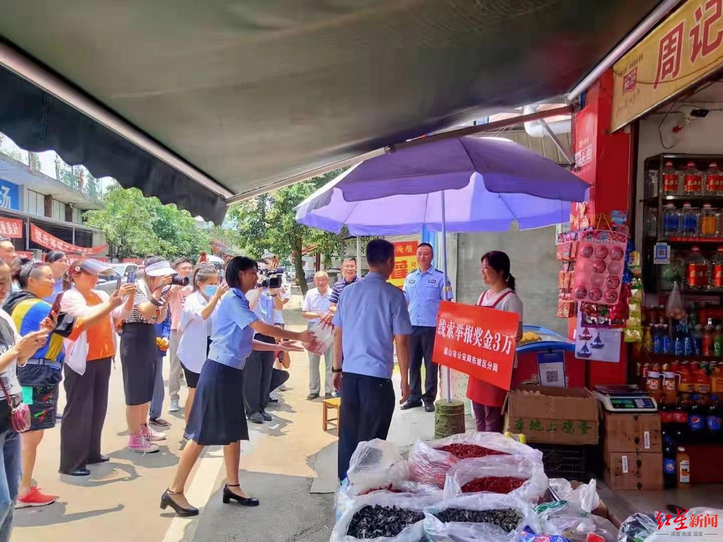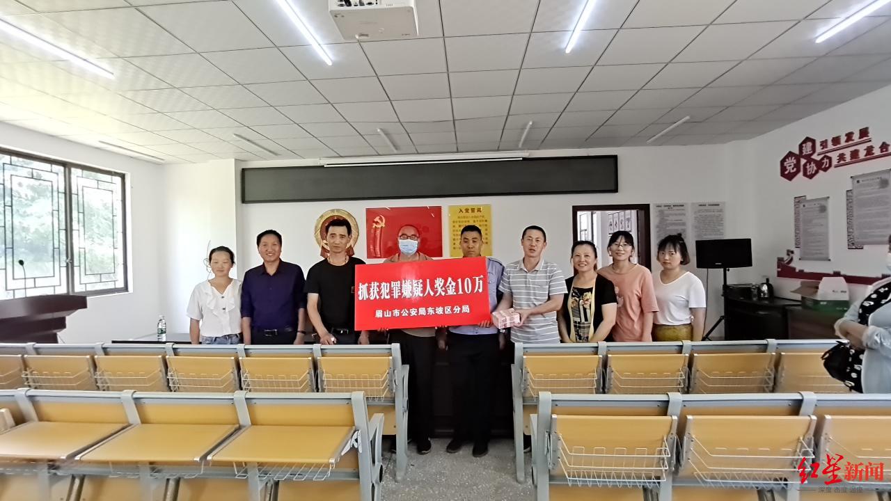 6月10日13时许,东坡区公安分局政委李志敏、副政委韩丽梅到东坡区思蒙镇碧江村,对积极向公安机关提供直接线索的超市店主兑现奖励3万元。