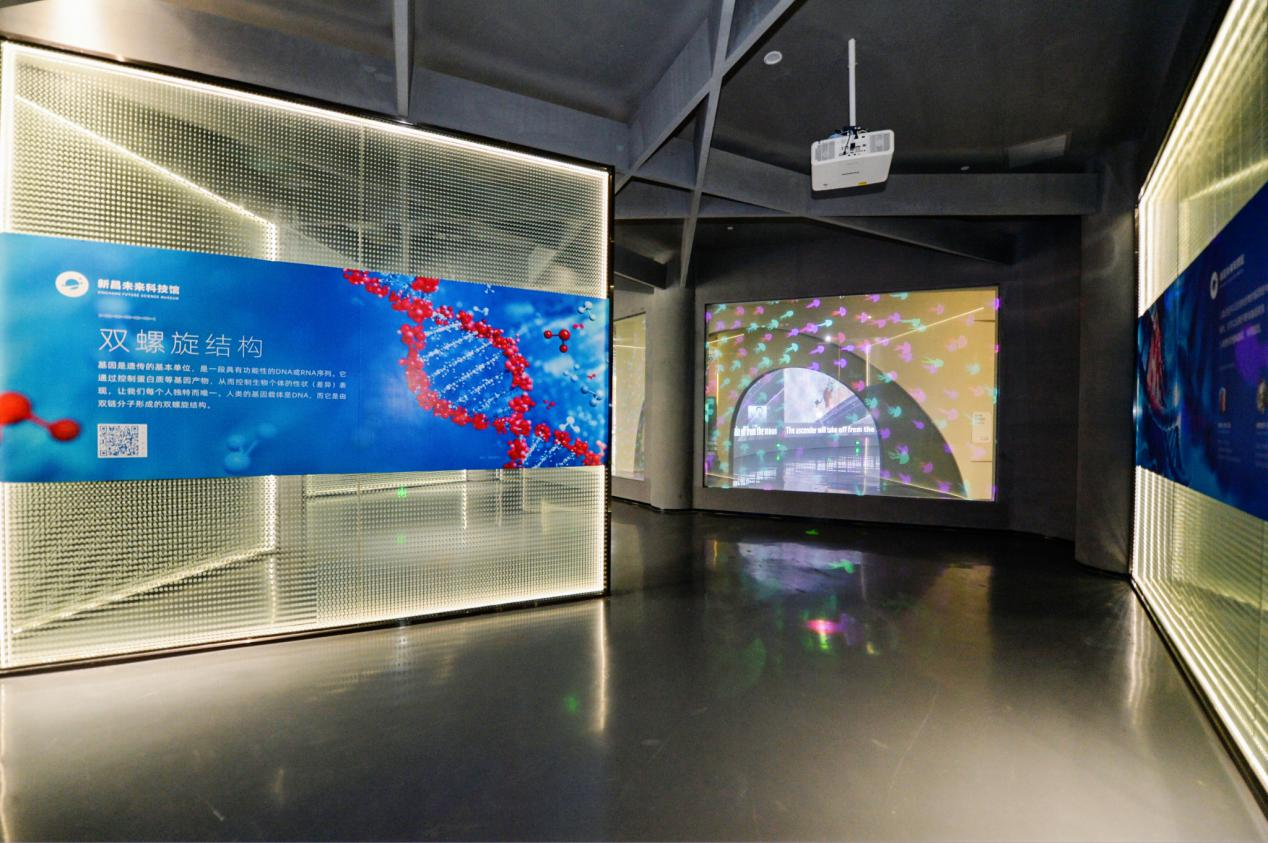 从史前文明的生命形态到人类基因的生命奥秘,新昌未来科技馆以纳米玻璃作为投影介质。观众在投影区域的双面都可以了解生命起源、生物进化、人类遗传基因与基因测序相关的科学知识,激发观众感知生命基础与基因遗传密码的神奇和探索生命未知领域的兴趣。