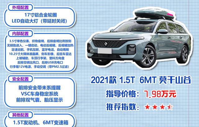 我们先来看最入门的莫干山谷,作为全系唯一的手动挡车型,指导价为7.98万元。配置方面,这款车型的配置并不低,标配了LED自动大灯、17寸轮圈和车顶行李架,在外观上和高配车型差别不大。此外,作为手动挡车型,莫干山谷还装备了比较少见的定速巡航,可见官方确实想打造一台年轻人的出游用车,毕竟在高速上打开定速巡航体验会好很多。倒车影像和后驻车雷达的加入也降低了新手停车的难度,比较贴心。不过没有内后视镜防眩目还是有些不方便,车主后期可以自行改装带行车记录仪的内后视镜来解决这个问题。总体来说,这个配置能值回票价,对于那些预算比较紧张的朋友还是可以考虑的,推荐指数三星半。