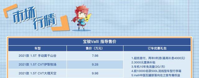 行情方面, 宝骏Valli本次共推出4款新车,售价区间为7.98-10.58万元。目前由于新车上市,目前官方优惠为两年0息贷款、3000元置换补贴、车机10年免流量、前10000名车主赠送车顶行李箱。