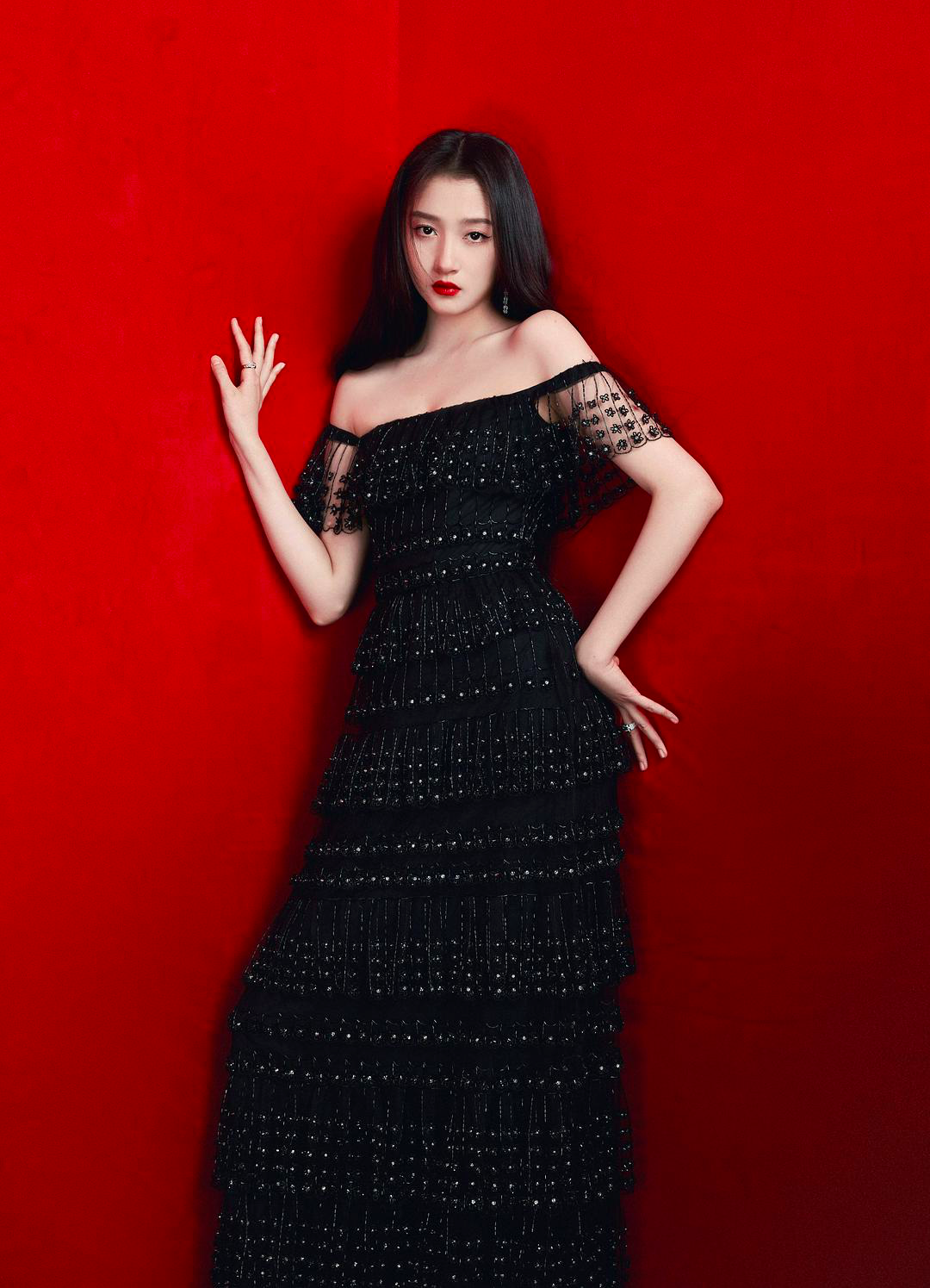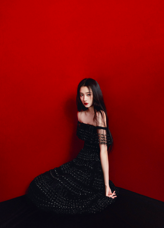 第二套是一字肩黑长裙,个人觉得比红色那套还好看,工作室审美很在线了。