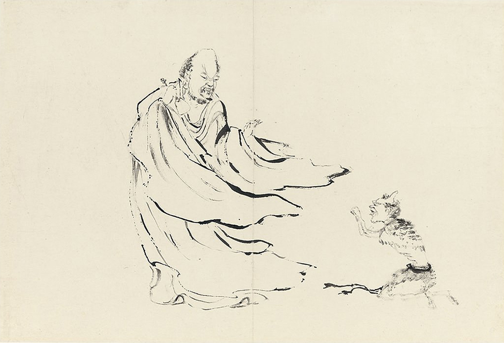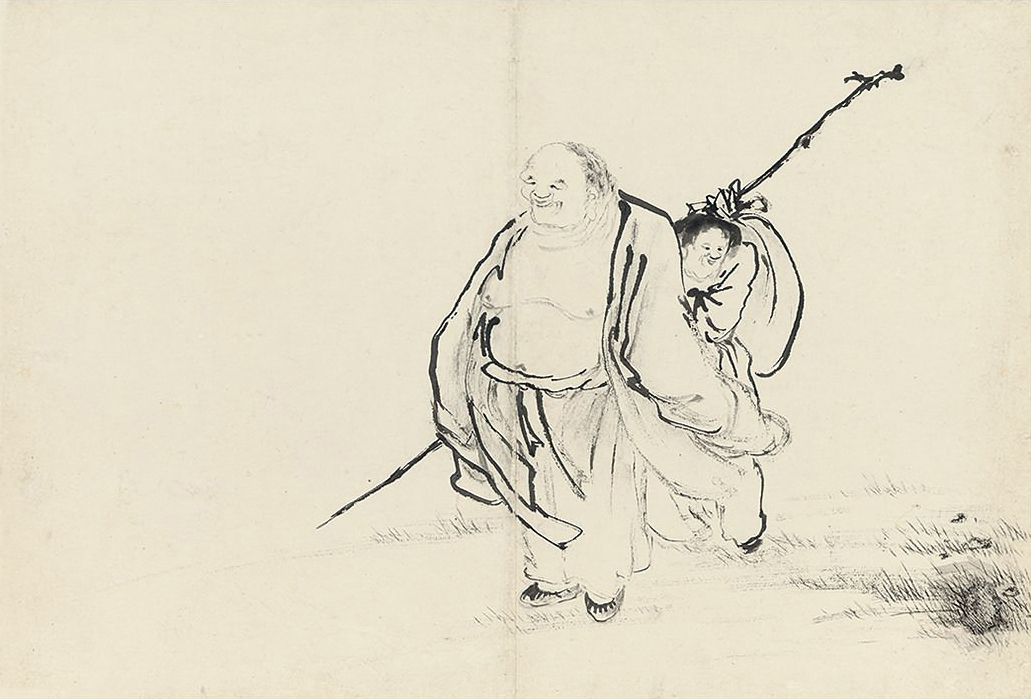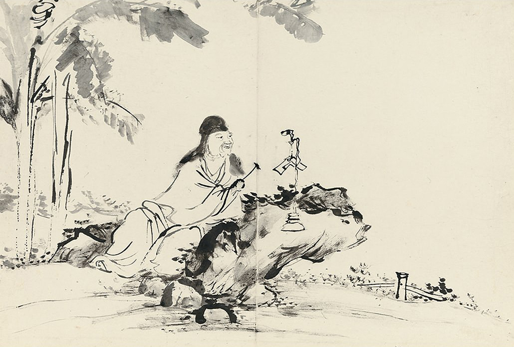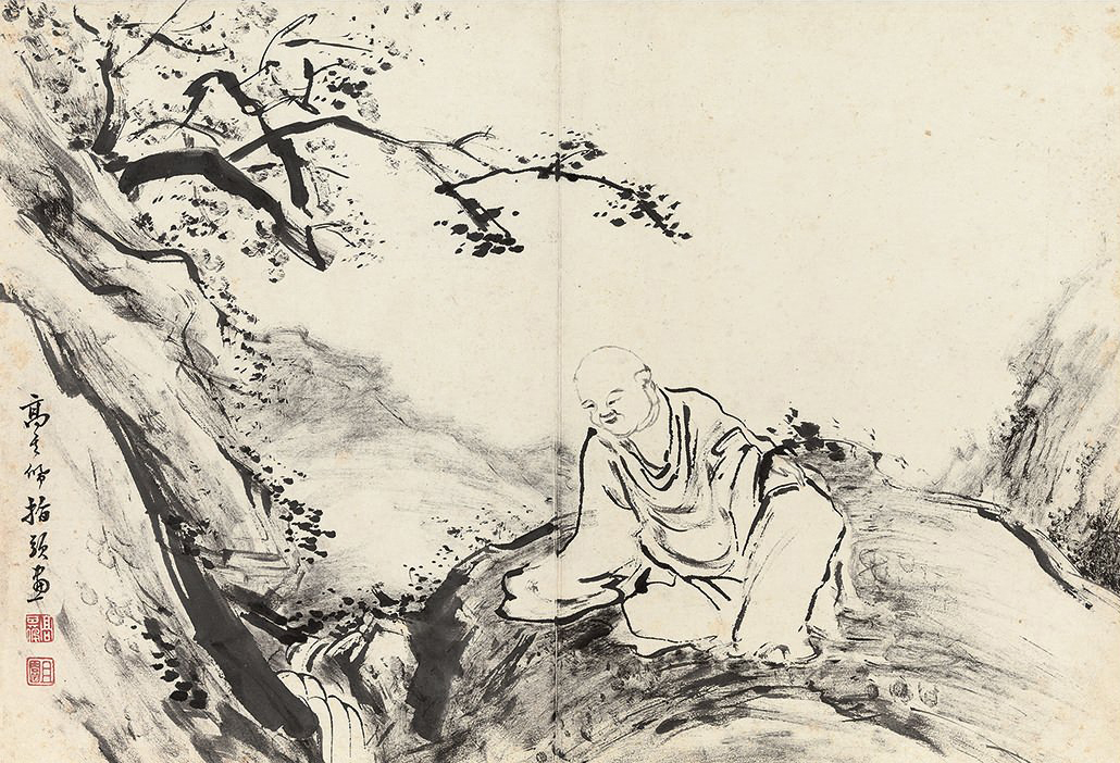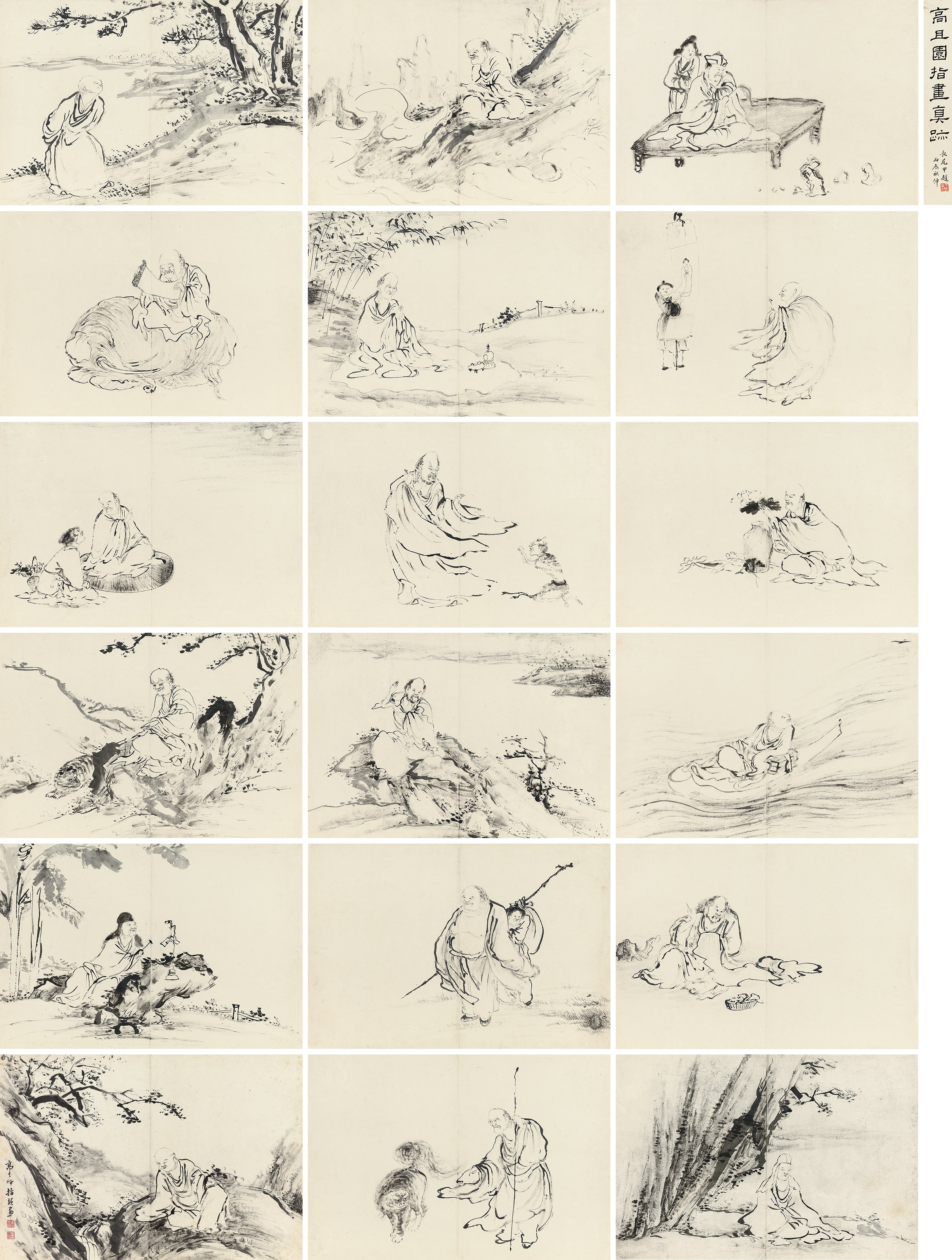 此册作十八罗汉像,种种变相,种种法门,天上人间,若真若幻。不仅造型生动,即树石布境,皆指随心运,气韵悉备。作指画,犹有书卷气,则尤为难能,是其生平极精之作。