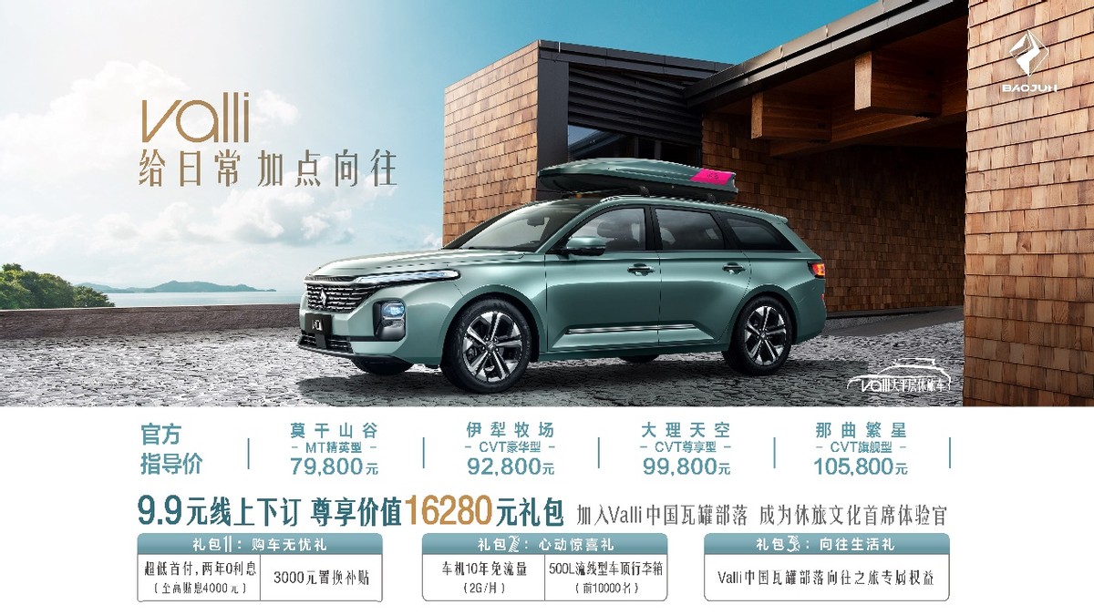 6月10日,宝骏Valli正式上市,共推出4款车型(莫干山谷MT精英型、伊犁牧场CVT豪华型、大理天空CVT尊享型、那曲繁星CVT旗舰型),售价区间为7.98-10.58万元。新车定位“大平层休旅车”,如此亲民的售价相比会让众多喜欢自驾游的朋友蠢蠢欲动。