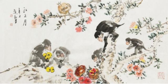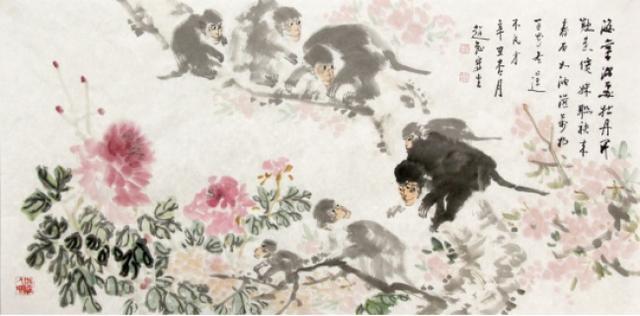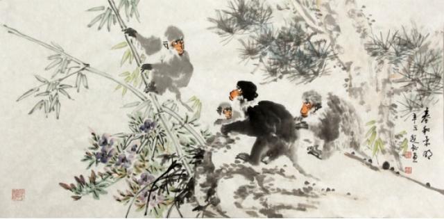 中国画离不开笔、墨、纸、砚。主要表现就是水墨,关键在骨法用笔。我在猴画中已经加了很多颜色去辅助猴子的表现。为了有层次感,有的地方用得很淡,隐隐约约。画上每一笔,都是在一幅画的整体之中的一个不可缺的部分。有点、线、面,有主体的猴,依次渐简。我用的色都是苏州市姜思序生产的颜料,真正做到,墨彩交融。大家只要把画托好,装框,挂出来,隔一定的距离,细细地欣赏,再淡的地方都能显现出来,很有韵味。给人以美感,使人的心灵安静下来。这就是我作为画家的责任。