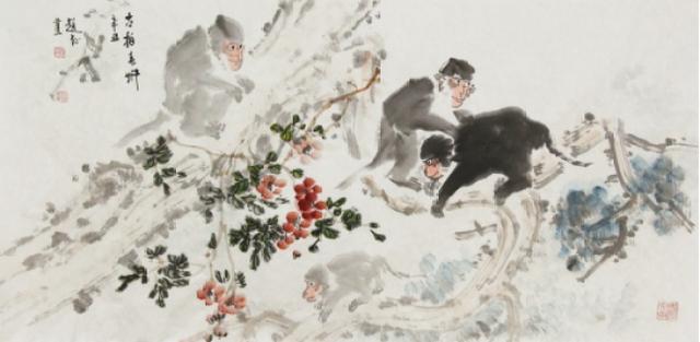 水墨是引领人们从视觉的喜好,进一步深入到心灵艺术的愉悦过程。笔墨是中国画的灵魂,为了画好水墨,首先是材料的考究上,我用冬天的雪融化后的水,贮于古瓶中,每天注在端砚上,用超细油烟墨研磨。买近三千元一刀的红星特级净皮。每天清晨,总是先练字,看书,待有心得之后再展纸注视、构思。心态是极其安静,思绪浮想联翩。当仿佛看到纸上有了猴子的形象后,再用大羊毫斗笔饮水、调墨,笔根是淡墨,笔肚是中墨,笔尖是浓墨,蘸好墨去挥写。我的水墨猴画,大家能体会、欣赏到:有皮毛、筋肉、骨骼。更主要的是神采,饱含情感的因素,如夫妻之爱、母子之情、得果之喜、游玩之乐。