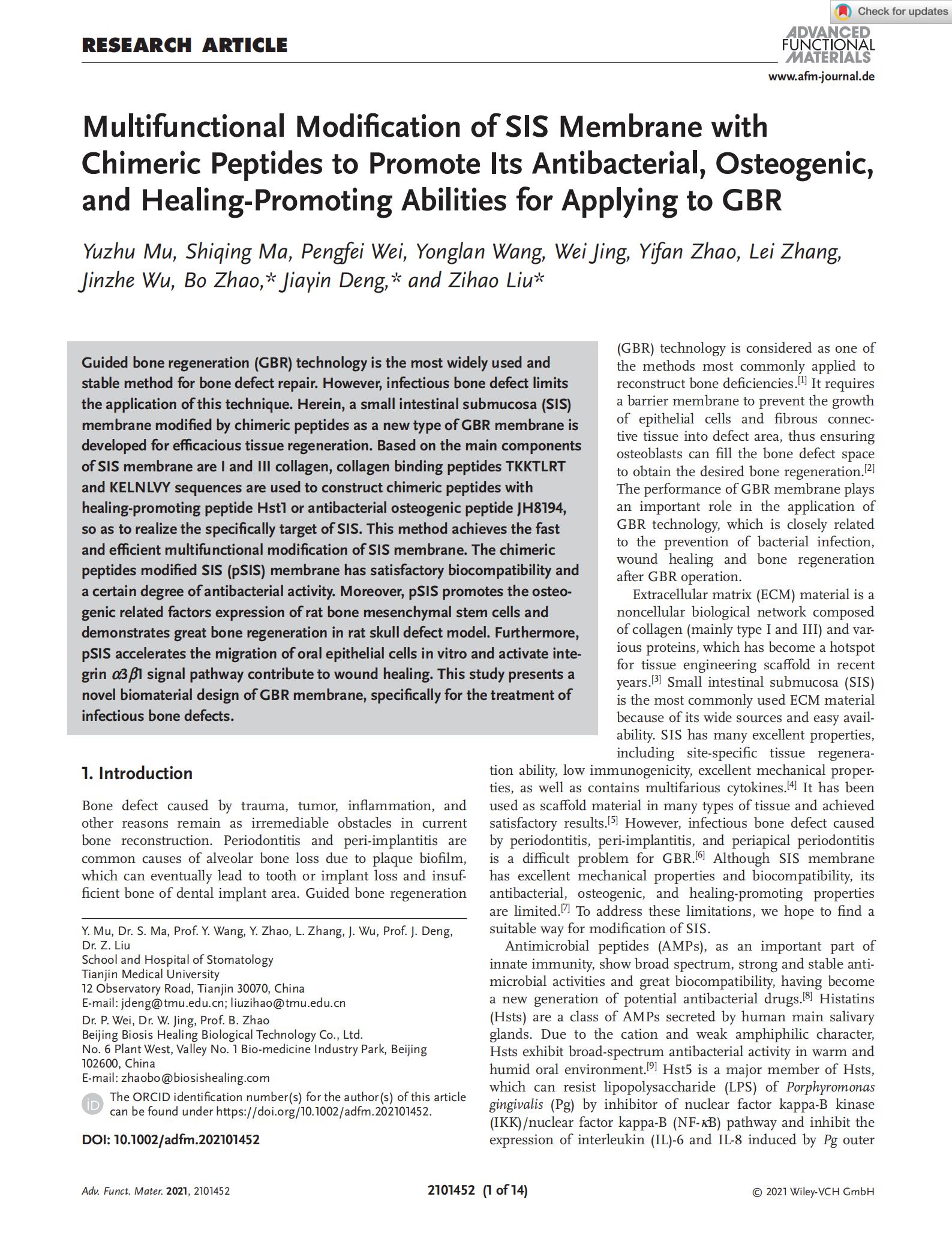 2021 年 6 月 7 日,材料领域国际顶级期刊《Advanced Functional Materials》【中文译名《先进功能材料》】,以《Multifunctional Modification of SIS Membranes with Chimeric Peptides to Promote Its Antibacterial, Osteogenic, and Healing-Promoting Abilities for Applying to GBR》【中文标题《融合肽对 SIS 膜进行多功能改性提高其抗菌、成骨和促进愈合的能力应用于引导性骨再生的研究》】为题,全文刊登了博辉瑞进具有自主知识产权的 SIS 生物材料领域的研究成果,该期刊影响因子高达 16.8!