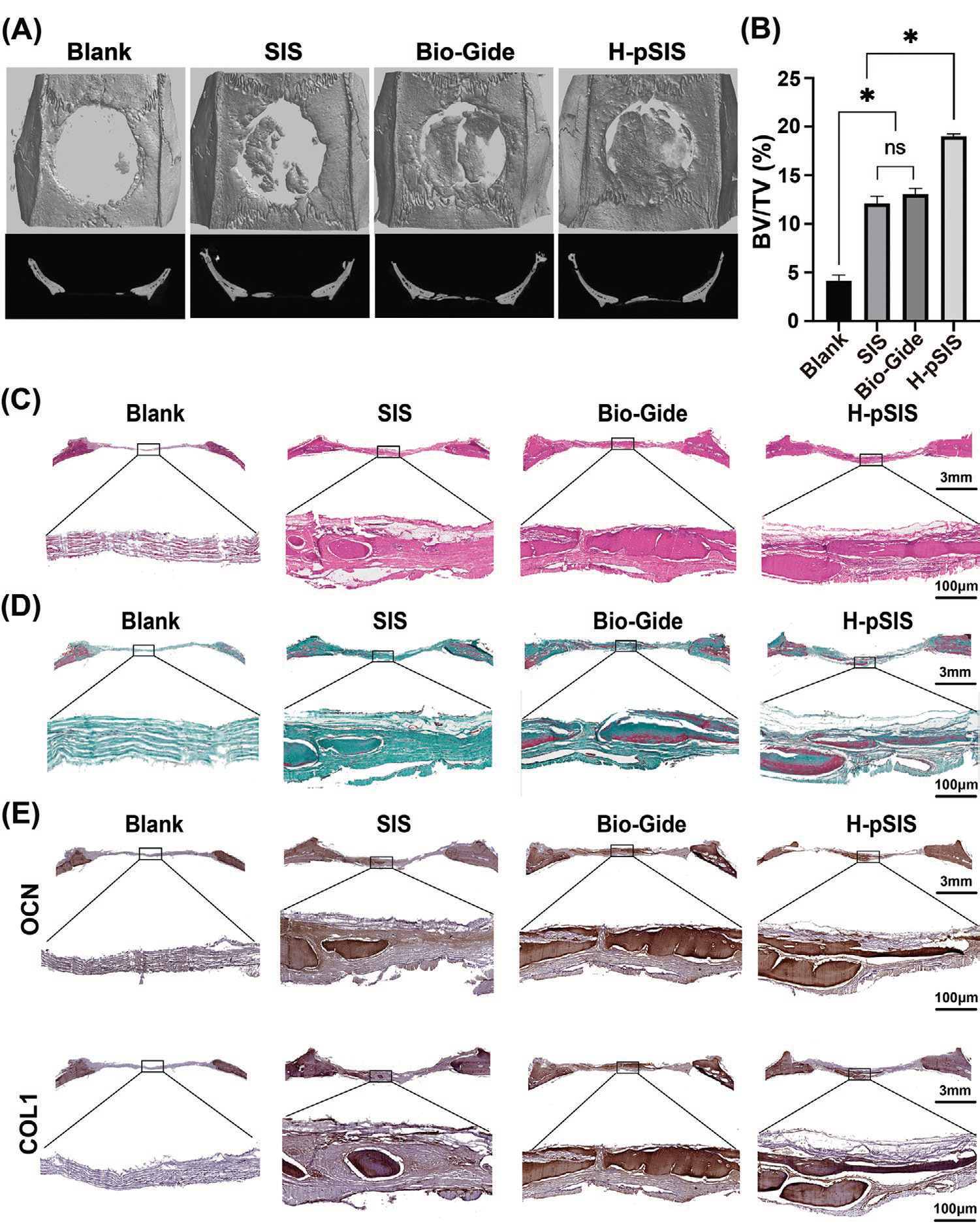 该研究在SIS生物膜的基础上,利用胶原靶向肽 TKKTLRT 和 KELNLVY 序列构建具有促愈合肽 Hst1 或抗菌成骨肽 JH8194 的融合肽,实现了 SIS 膜的快速、高效的多功能改性,改性膜(pSIS)提高了SIS膜在抗菌、成骨和促愈合方面的能力,进一步提高了SIS材料的多功能性。该研究为博辉瑞进 SIS 生物材料在引导骨再生和口腔软组织修复的应用上提供了可靠的理论基础。更值得期待的是,博辉瑞进SIS口腔修复膜产品已进入注册审批阶段,有望尽快上市应用于临床,打破国内种植牙市场的进口垄断困局。