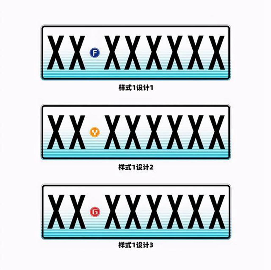 从网站申请图来看,第一种全新车牌以白底为主色调,从上至下呈现出蓝色渐变样式,但不同于现款(92式)车牌照的是,车牌上不再用白色字体显示字符信息,而是用黑色字体展示,总共加起来有八位的字符信息,并且在号牌最前端显示的两个字符还用圆形图案来进行分隔,图案则是采用了蓝、黄、红三种颜色,上面字母对应着的分别是非运营(F)、运营(Y)、国家机关(G)。