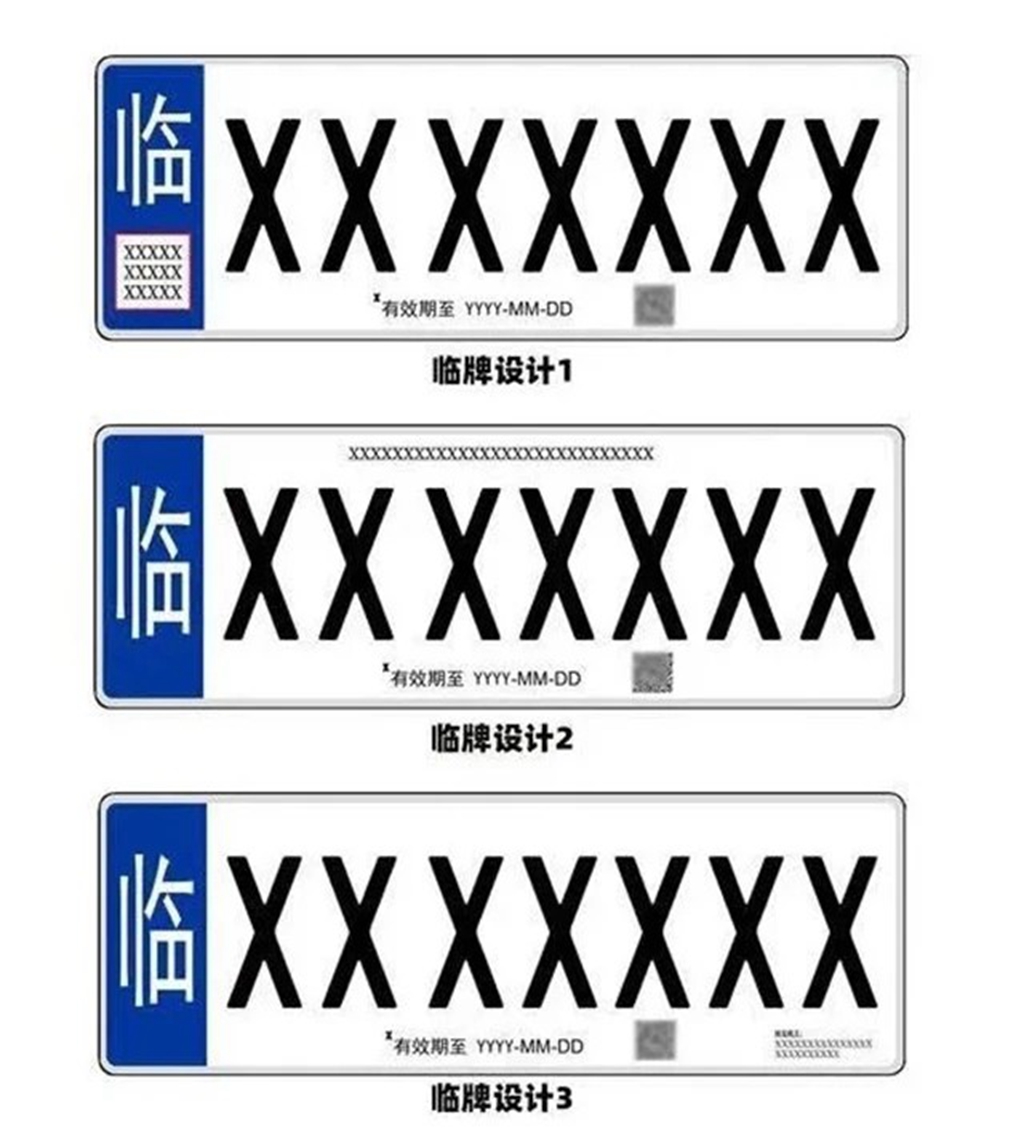 此次在网上公示的还有全新样式的临时行驶车牌,并且提供了3种不同的样式,但三种最左边均为蓝底白字“临”设计,只不过三种的区别在于相关行驶信息字符被设计的位置都不太一样,但有效期与识别二维码均设计在了中央位置,便于交警观察。