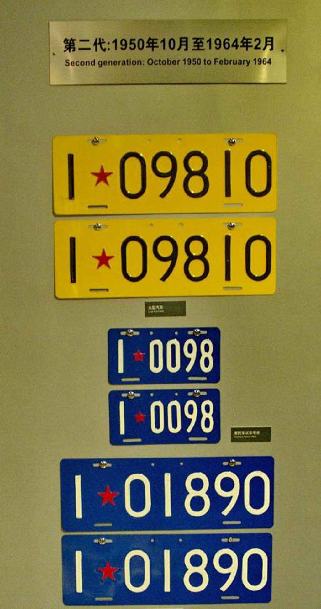 第二代车牌的发放时间为1950年10月到1964年2月,这也是真正意义上全国统一车牌后的样式,采用了五角星+数字的组合,并取消了文字。