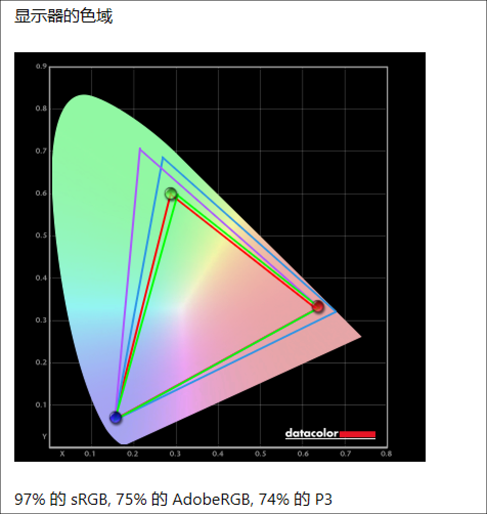 屏幕的色域覆盖实测为97%sRGB,色准方面,Delta E最大值为4.66,最小值是0.45,平均值为1.07,一般认为,Delta E在2以内,人眼基本分辨不出色彩的差异,为专业级别的显示器,能够胜任摄影后期等平面调色应用。实测屏幕最高亮度约为321尼特,这在同价位轻薄本里算也算是比较高的。