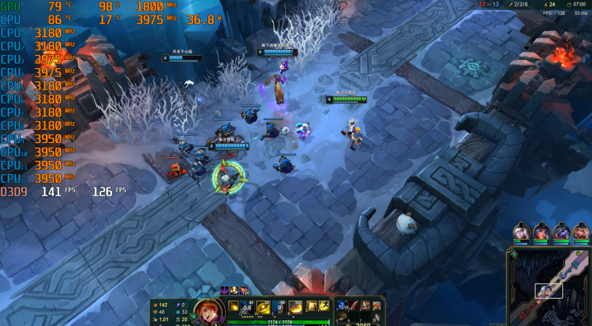 游戏实测方面,考虑到RedmiBook Pro 15锐龙版是一款标压集显轻便机型,定位于日常简单游戏娱乐,因此牛叔选择的是热门网游《英雄联盟》来考查实战表现。实战来看,FHD下最高画质运行《英雄联盟》很轻松。如截图所示,RedmiBook Pro 15锐龙版的处理器封装功耗几乎全程保持在36W左右,频率能达到3.9GHz,显卡频率为1800MHz,帧速实时帧速141fps,前7分钟的平均帧速为126fps,在激烈的团战中也能保持100fps以上的帧速。如果把屏幕分辨率提升到原生3200×2000,画质设定为中等,运行《LOL》7分钟的平均帧速为79fps,比较激烈的团战中分数为60~70fps,可玩但对流畅性略有一些影响——毕竟这只是一款集显。