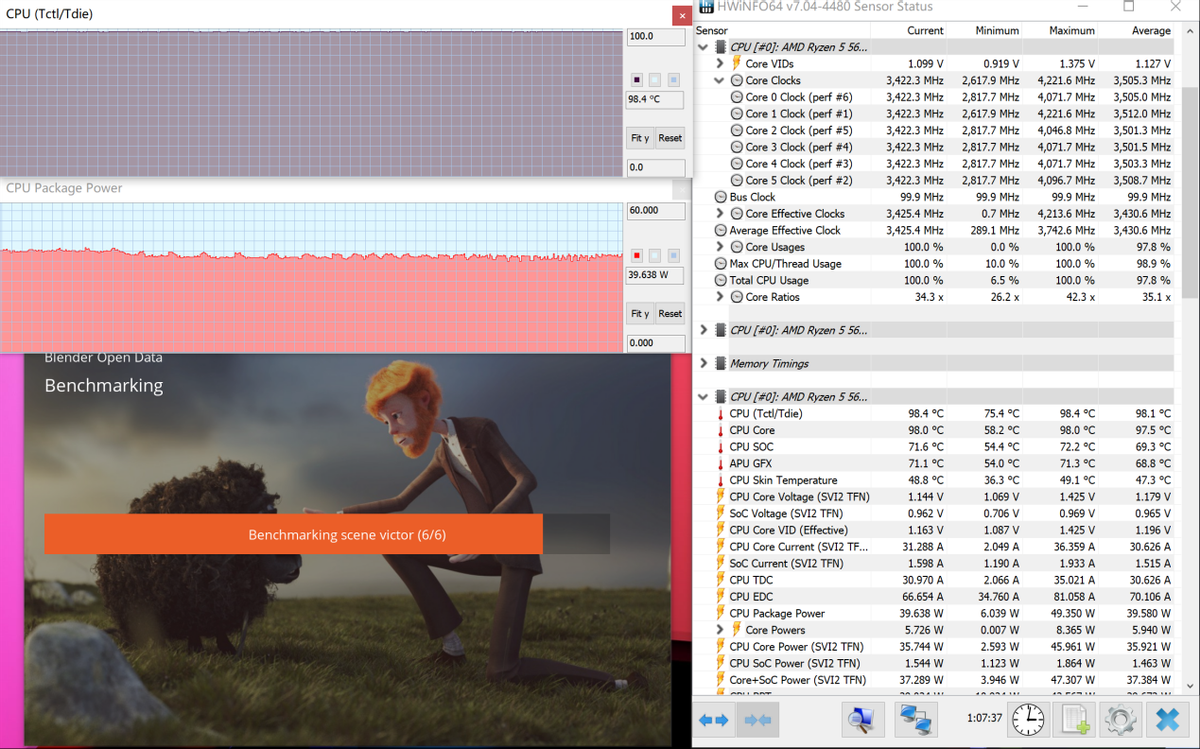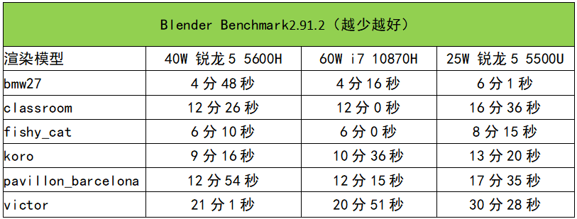 ▲在长时间满载应用测试中,牛叔选了Blender(版本2.91.2)六个场景连续渲染来考查RedmiBook Pro 15锐龙版长时间持续性能释放情况。从渲染过程来看,RedmiBook Pro 15锐龙版能维持40W左右持续性能输出,处理器频率为3.4GHz,温度98.4℃,和单考处理器一致。最终测试成绩如下表所示。