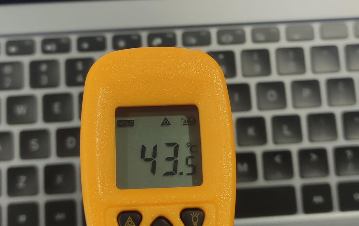 表面温度和噪声:键盘区域热量堆积在键盘中上区域,数字键6、7在 43℃左右,靠近屏幕下方的金属区域能达到46.5℃,长时间接触这里就比较烫手了,但好在不是按键区域,使用时也不会触碰,W、S按键则不到40℃,微有热感。噪声方面,考机满载时键盘上方的噪声约56dBA,用户位约48dBA,在比较安静的环境里噪声较明显,但不刺耳。