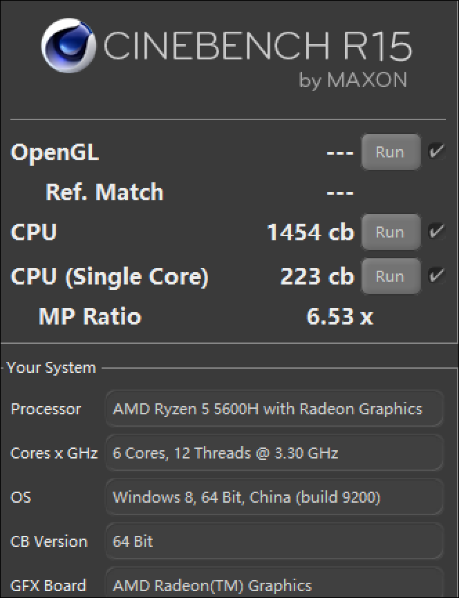 ▲Cinebench R15,RedmiBook Pro 15锐龙版多核得分是1454cb,单核得分223cb,成绩不错。作为参考,跑25W款的锐龙5 5500U的多核得分是1117cb,单核175cb——该项测试中,锐龙5 5600H多核性能领先约30%,单核领先33%。 此外,跑60W的i7 10870H多核是1513cb,也就是说此项基准测试中,锐龙5 5600H以6核达到了上一代8核i7的水准。