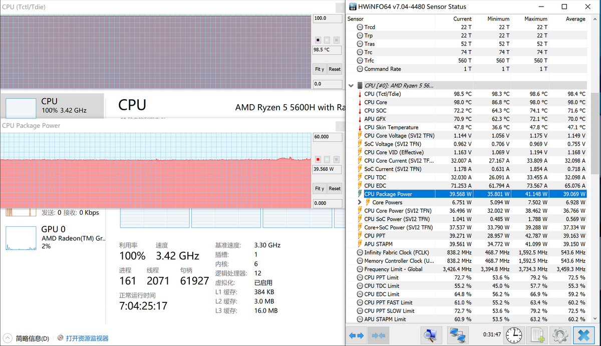 实际性能释放方面,处于室内办公环境温度27℃左右且空气较热时,考机时(设置为最高性能模式)RedmiBook Pro 15锐龙版的处理器持续性能释放约为39W/3.4GHz/98.5℃;如果处于25℃的室内并开启空调,该机的处理器功率会上升到43W左右,贴近标准功率释放,频率也略有上升到3.5GHz附近,温度保持在98.4℃——这应该是它的控制温度。