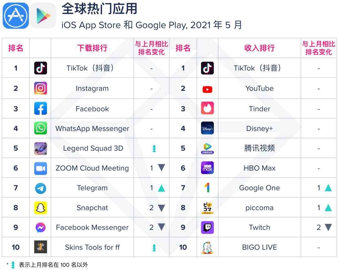 据榜单显示,在5 月全球IOS平台和Google平台下载排行中,TikTok、Instagram、Facebook 稳居前三,而Legend Squad 3D和 Skins Tools Pro for ff则从100名外新上榜。而收入榜则没有大的变化,两大出海品牌TikTok和Bigo Live双双上榜。其中,榜首的TikTok包含了抖音在中国大陆的收入数据。据悉,这是自2020年3月以来,两大出海品牌连续15个月携手上榜。