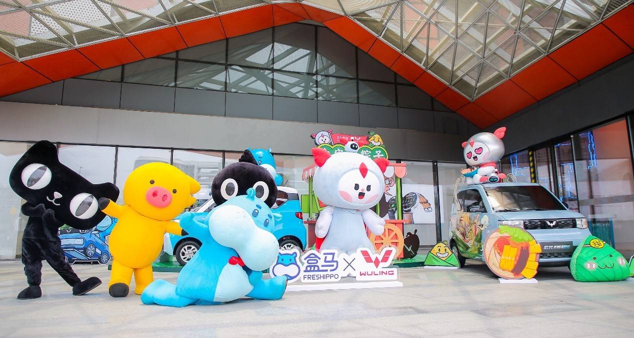 在杭州快闪现场,阿里动物园欢乐助阵,盒马、天猫、蚂蚁、飞猪等阿里小动物们与五菱活力体验官小五和小菱共聚快闪现场,开启超萌跨界大联动,为现场带来欢乐氛围。